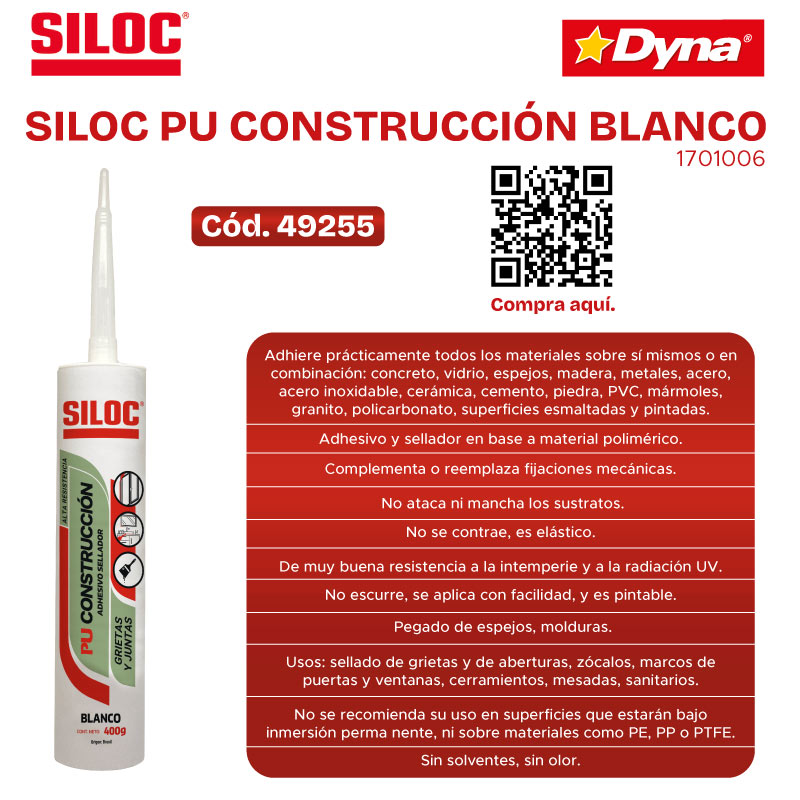 Adhesivo y sellador en base a material polimérico. Adhiere prácticamente todos los materiales sobre sí mismos o en combinación: concreto, vidrio, espejos, madera, metales, acero, acero inoxidable, cerámica, cemento, piedra, PVC, mármoles, granito, policarbonato, superficies esmaltadas y pintadas. Complementa o reemplaza fijaciones mecánicas. No ataca ni mancha los sustratos. No se contrae, es elástico. De muy buena resistencia a la intemperie y a la radiación UV. No escurre, se aplica con facilidad, y es pintable. Sin solventes, sin olor. No se recomienda su uso en superficies que estarán bajo inmersión permanente, ni sobre materiales como PE, PP o PTFE. Usos: sellado de grietas y de abertu
