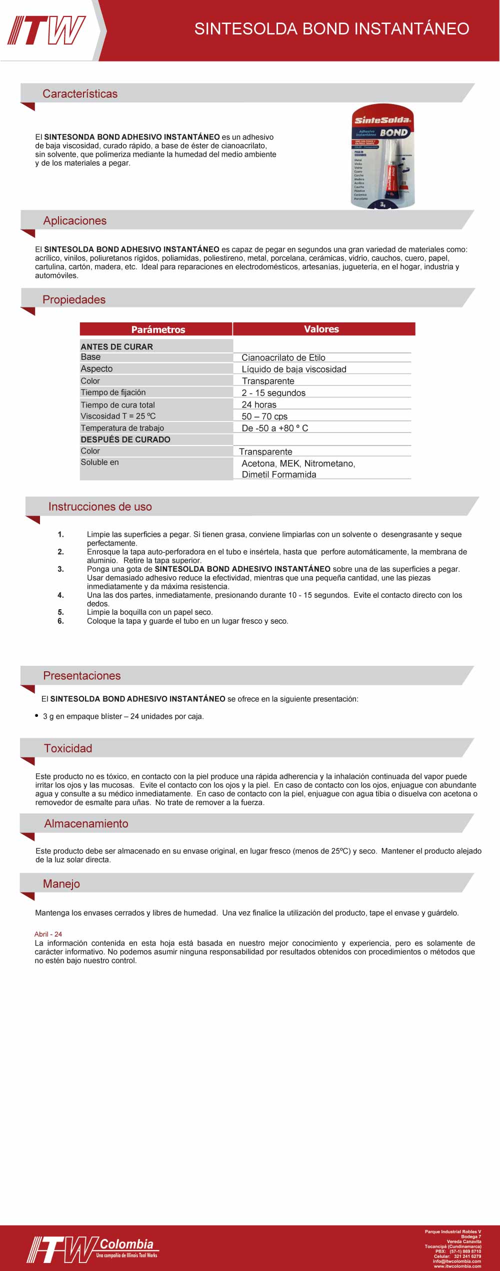 Es Un Adhesivo De Baja Viscosidad, Curado Rápido, A Base De Éster De Cianoacrilato Sin Solvente, Que Polimeriza Mediante La Húmedad Del Medio Ambiente Yde Los Materiales A Pegar