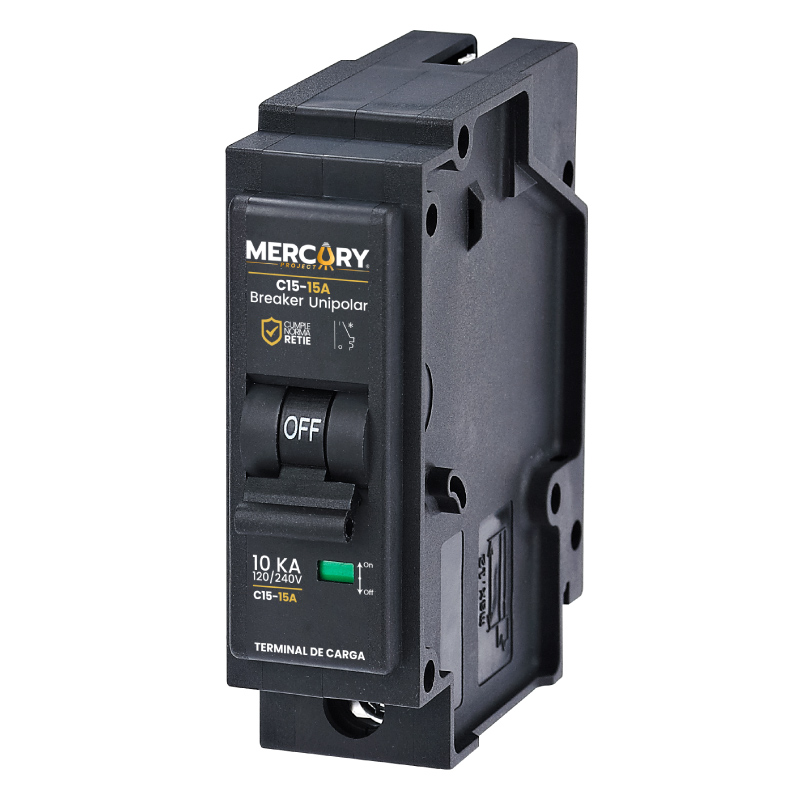 Interruptor termomagnético ideal para proteger contra sobrecargas y cortocircuitos. Tiene 1 Polo, capacidad de 15 amperios. Capacidad de corte de 10 kA. De uso exclusivo para cables de cobre_ Tipo de curva de disparo: C _Temperatura de operación: -20 a 50°C