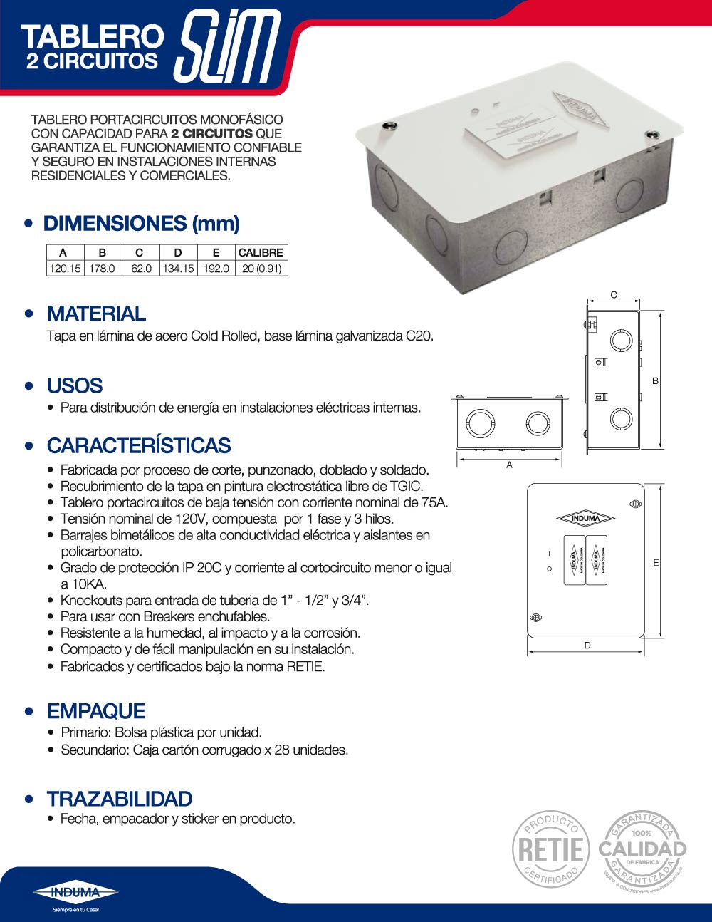 Tablero Portacircuitos de 2 Circuitos Slim, Certificado RETIE, Con Base en Lamina Galvanizada y Tapa Recubierta Con Pintura Electrostatica, Tablero Portacircuitos Certificado RETIE, Con knockouts de 1/2" - 3/4" y 1". Comaptible Con Breakers Enchufables. Bornera en Aleación de Aluminio.