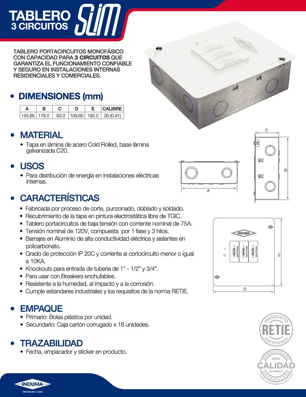 Tablero Portacircuitos de 3 Circuitos Slim, Certificado RETIE, Con Base en Lamina Galvanizada y Tapa Recubierta Con Pintura Electrostatica, Tablero Portacircuitos Certificado RETIE, Con knockouts de 1/2" - 3/4" y 1". Comaptible Con Breakers Enchufables. Bornera en Aleación de Aluminio.