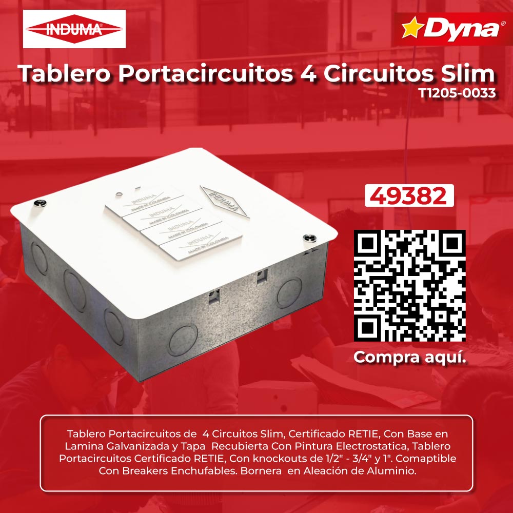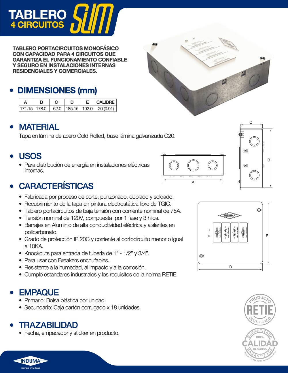 Tablero Portacircuitos de 4 Circuitos Slim, Certificado RETIE, Con Base en Lamina Galvanizada y Tapa Recubierta Con Pintura Electrostatica, Tablero Portacircuitos Certificado RETIE, Con knockouts de 1/2" - 3/4" y 1". Comaptible Con Breakers Enchufables. Bornera en Aleación de Aluminio.