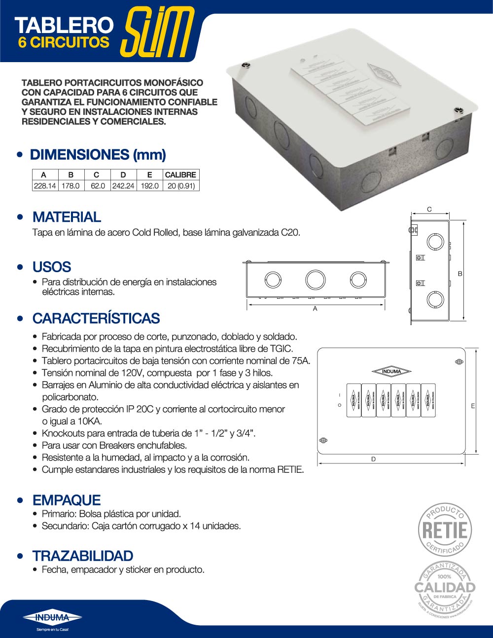 Tablero Portacircuitos de 6 Circuitos Slim, Certificado RETIE, Con Base en Lamina Galvanizada y Tapa Recubierta Con Pintura Electrostatica, Tablero Portacircuitos Certificado RETIE, Con knockouts de 1/2" - 3/4" y 1". Comaptible Con Breakers Enchufables. Bornera en Aleación de Aluminio.