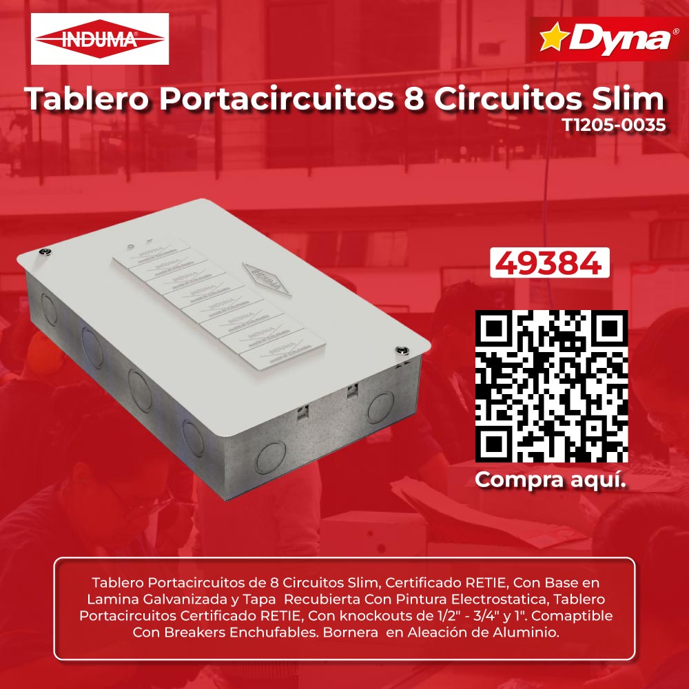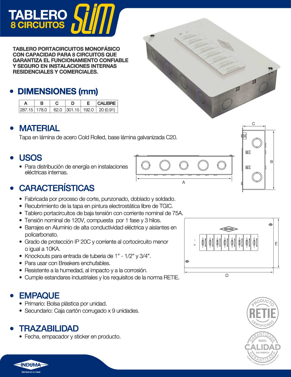 Tablero Portacircuitos de 8 Circuitos Slim, Certificado RETIE, Con Base en Lamina Galvanizada y Tapa Recubierta Con Pintura Electrostatica, Tablero Portacircuitos Certificado RETIE, Con knockouts de 1/2" - 3/4" y 1". Comaptible Con Breakers Enchufables. Bornera en Aleación de Aluminio.