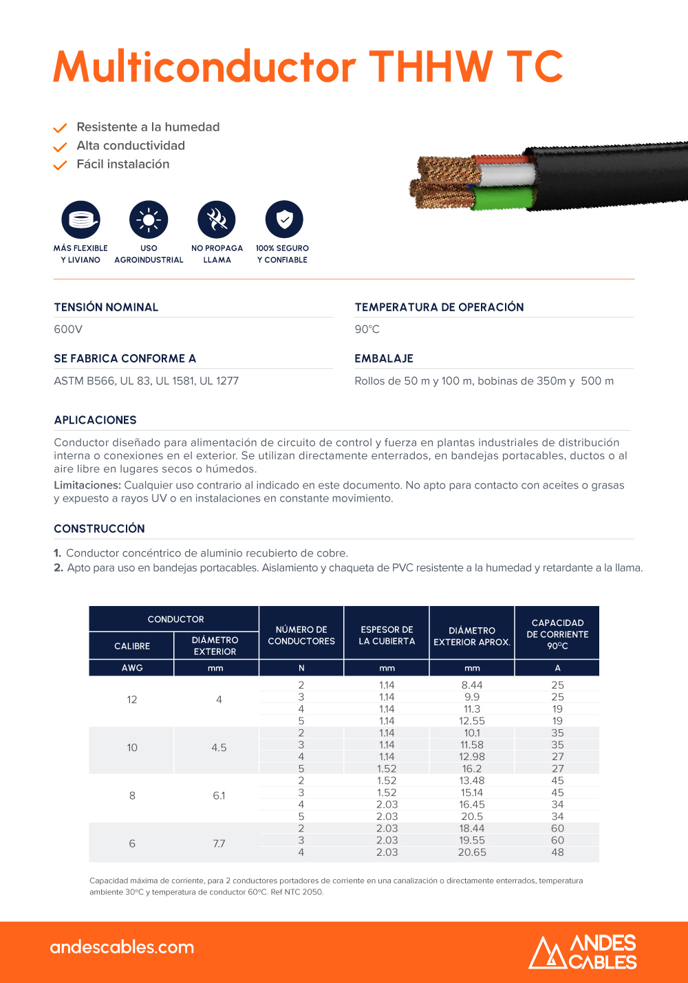 Cable Multiconductor THHW Color Negro Tensión nominal 600 V. Temperatura de operación 90ºC