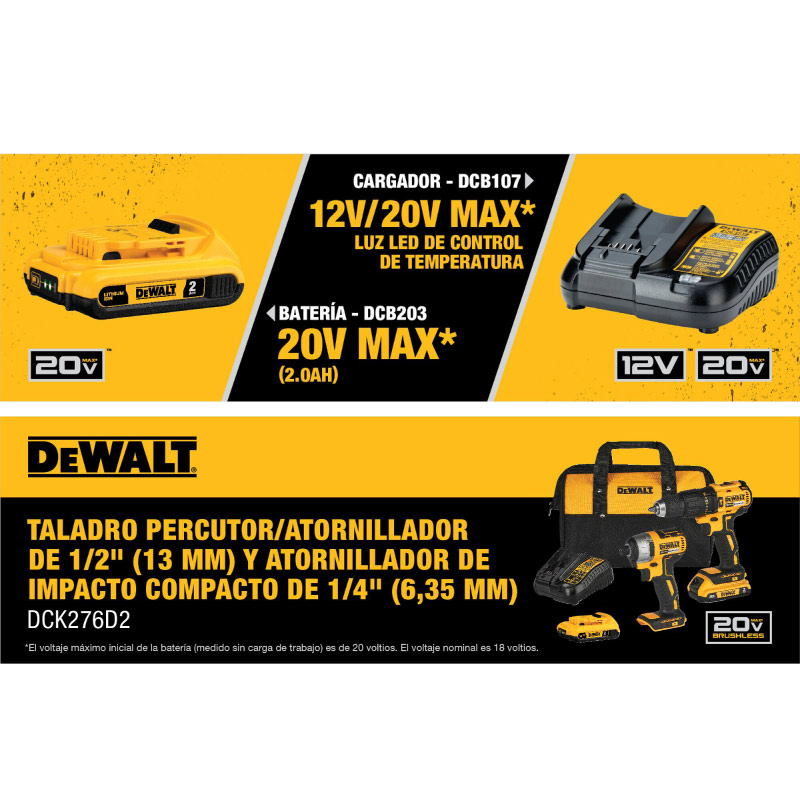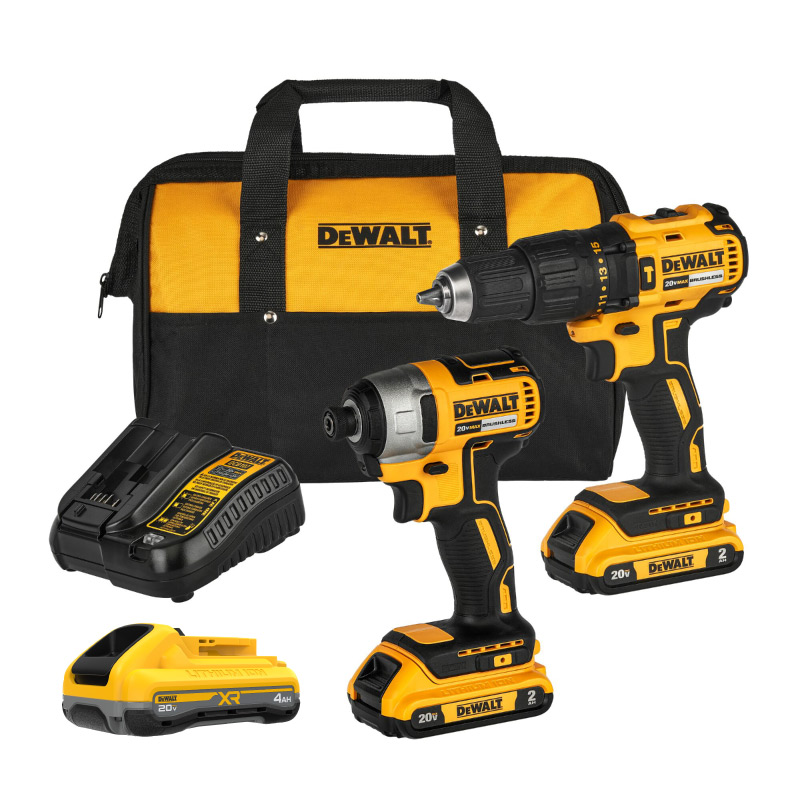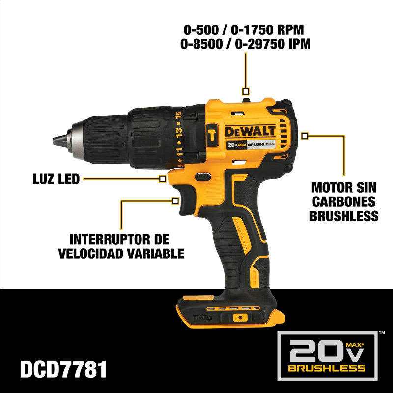 Super combo inalámbrico 20V de la nueva línea sin escobillas Dreamliner de Dewalt que contiene 1 Taladro Percutor De 1/2” DCD7781 + 1 Atornillador de impacto con encastre hexagonal de 1/4" y 170 Nm de torque DCF7871 + 2 baterías de 2Ah + 1 cargador + 1 bolso de lona. Adicionalmente, trae una batería de 4Ah con la nueva tecnología XR que permite que la carga dure más tiempo