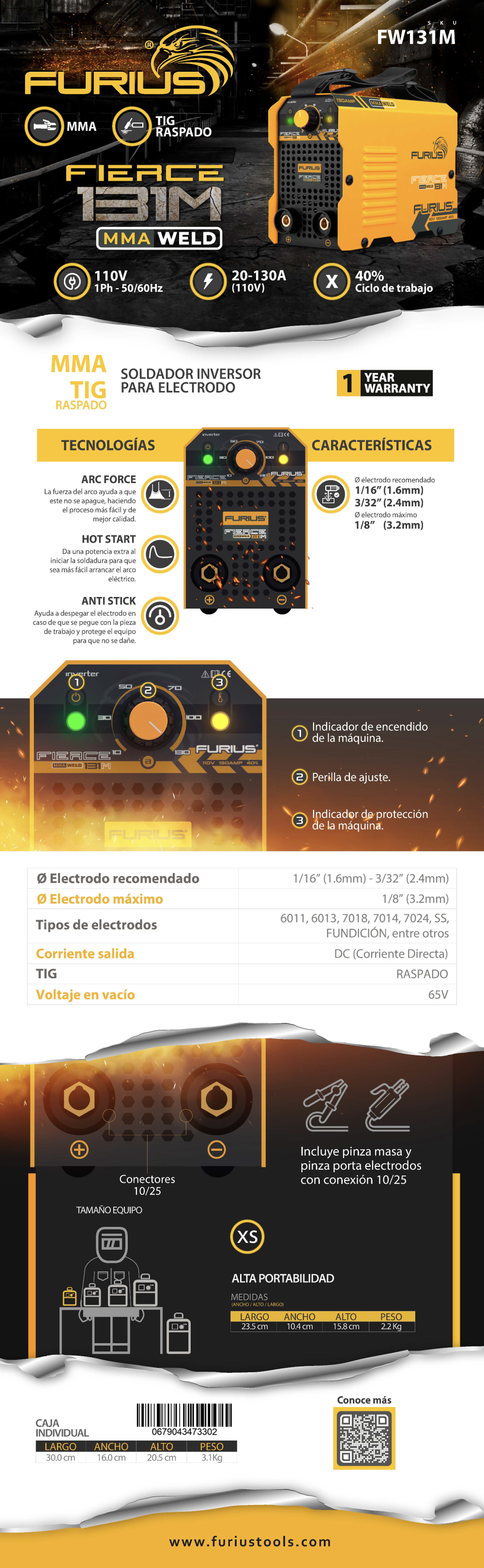 Soldador inversor portable y compacto para MMA y TIG Raspado 20-130A a 110V. Diámetro de electrodos 1/16"(1.6 mm) a 1/8”(3.2mm) en 6011 (Celulósico), 6013 (todos los Rutílicos), 7018, 7014, 7024 (todos los básicos), Inox SS, Fundición, Ni, entre otros. El ciclo de trabajo del electrodo 1/16"- 3/32" es 100%; de 1/8" es 40%. Cuenta con tecnología AntiStick, ArcForce y HotStart. Incluye: pinza masa y portaelectrodo con conexión 10/25. Peso 2,2 kg