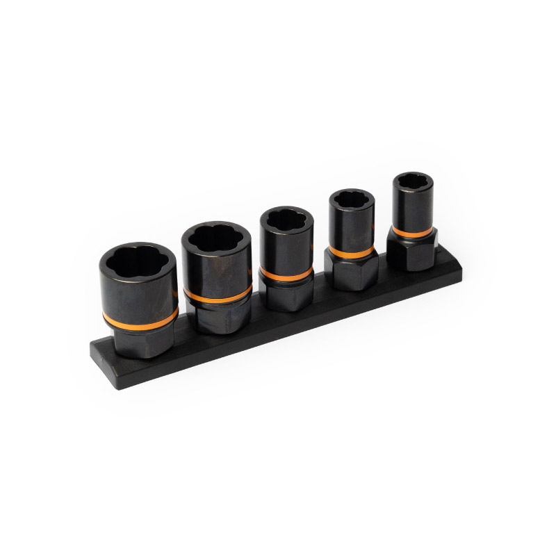Extrae tornillos oxidados y redondeados. Diseño interior innovador con canales cónicos para insertar fácilmente tornillos dañados. Dados medida dual para trabajar en tornillos milimétricos y en pulgadas. Diseño bidireccional para aflojar o ajustar tornillos dañados.