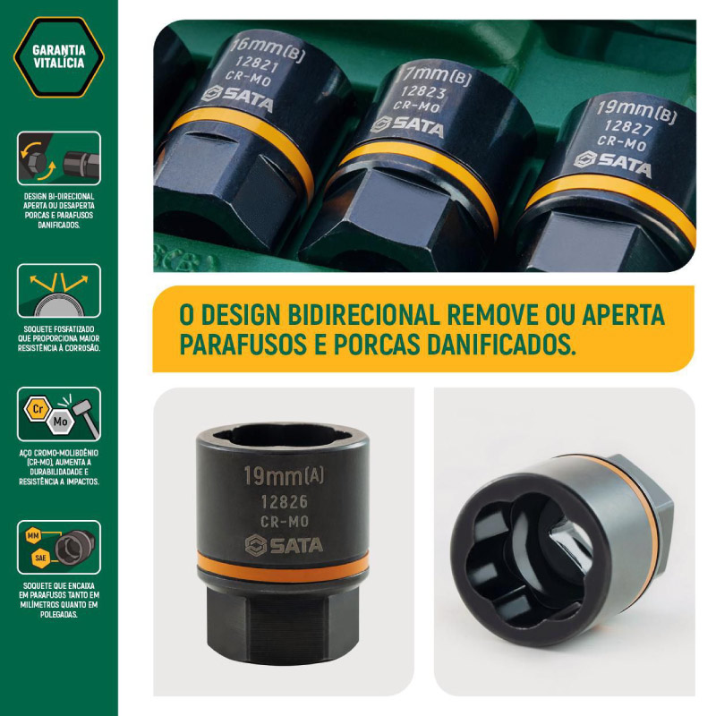 Extrae tornillos oxidados y redondeados. Diseño interior innovador con canales cónicos para insertar fácilmente tornillos dañados. Dados medida dual para trabajar en tornillos milimétricos y en pulgadas. Diseño bidireccional para aflojar o ajustar tornillos dañados.