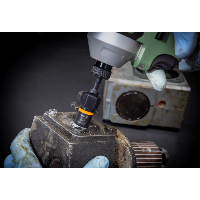 Extrae tornillos oxidados y redondeados. Diseño interior innovador con canales cónicos para insertar fácilmente tornillos dañados. Dados medida dual para trabajar en tornillos milimétricos y en pulgadas. Diseño bidireccional para aflojar o ajustar tornillos dañados.