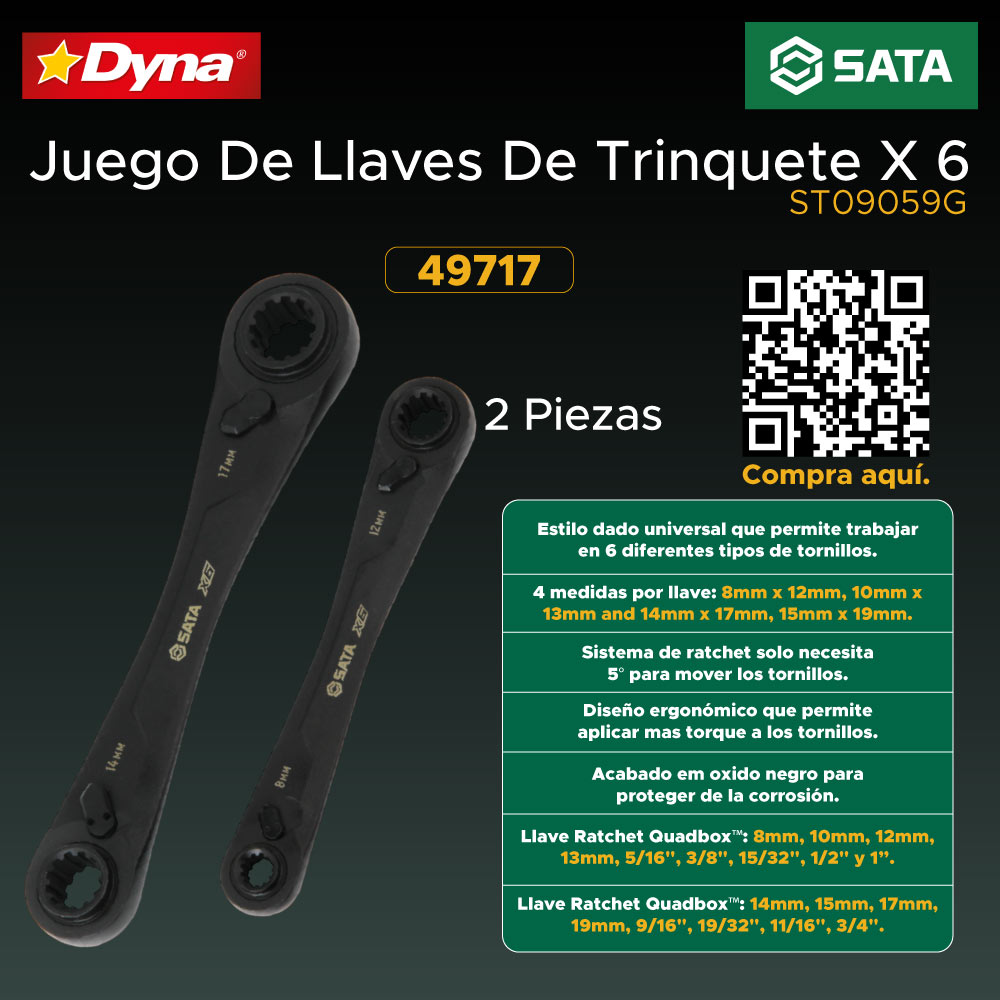 Estilo dado universal que permite trabajar en 6 diferentes tipos de tornillos. 4 medidas por llave: 8mm x 12mm, 10mm x 13mm and 14mm x 17mm, 15mm x 19mm. Sistema de ratchet solo necesita 5° para mover los tornillos. Diseño ergonómico que permite aplicar mas torque a los tornillos. Acabado em oxido negro para proteger de la corrosión. Llave Ratchet Quadbox™: 8mm, 10mm, 12mm, 13mm, 5/16", 3/8", 15/32", 1/2" y 1 Llave Ratchet Quadbox™: 14mm, 15mm, 17mm, 19mm, 9/16", 19/32", 11/16", 3/4"