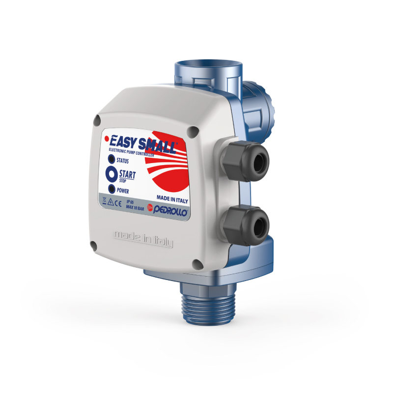 EASYSMALL es un dispositivo electrónico compacto y económico de mando y protección para electrobombas domésticas monofásicas, con potencia de hasta 1.5 HP. EASYSMALL se compone de un sensor de presión y un sensor de caudal, conectados a un sistema electrónico, que ponen en marcha la electrobomba cuando, al abrir un grifo, la presión del sistema desciende por debajo de la presión de rearme y la paran cuando el caudal es nulo o desciende por debajo de 2 lts/min. EASYSMALL también está equipado con: manómetro para una lectura inmediata de la presión, válvula de retención integrada e inspeccionable y dos bocas de impulsión para adaptarse al sistema existente.