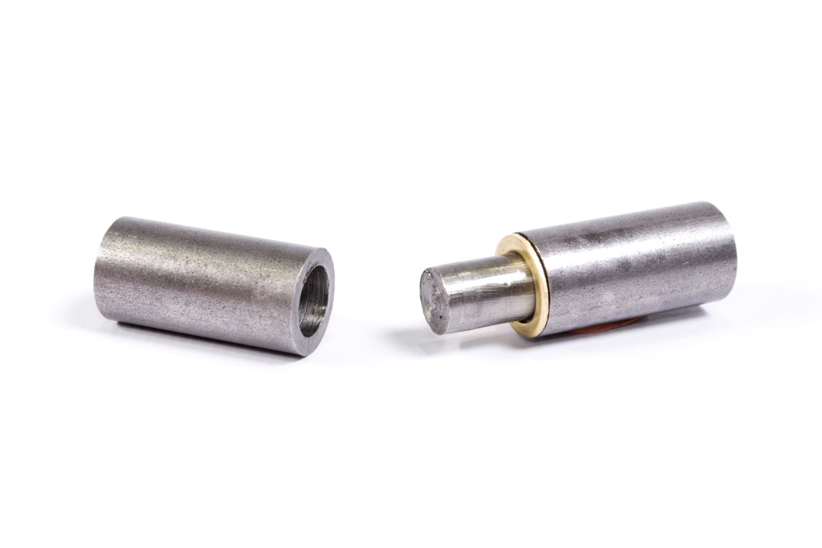 Fabricada en varilla de acero de alta resistencia, bisagra desarmable tipo piston para soldar en puertas metalicas, portones, puertas de garaje y rejas. con arandela para evitar desgaste entre piezas.