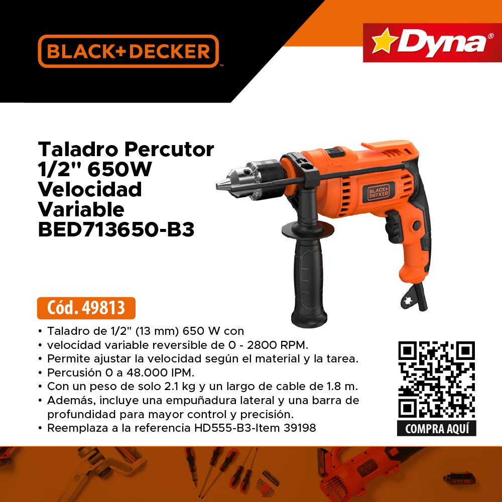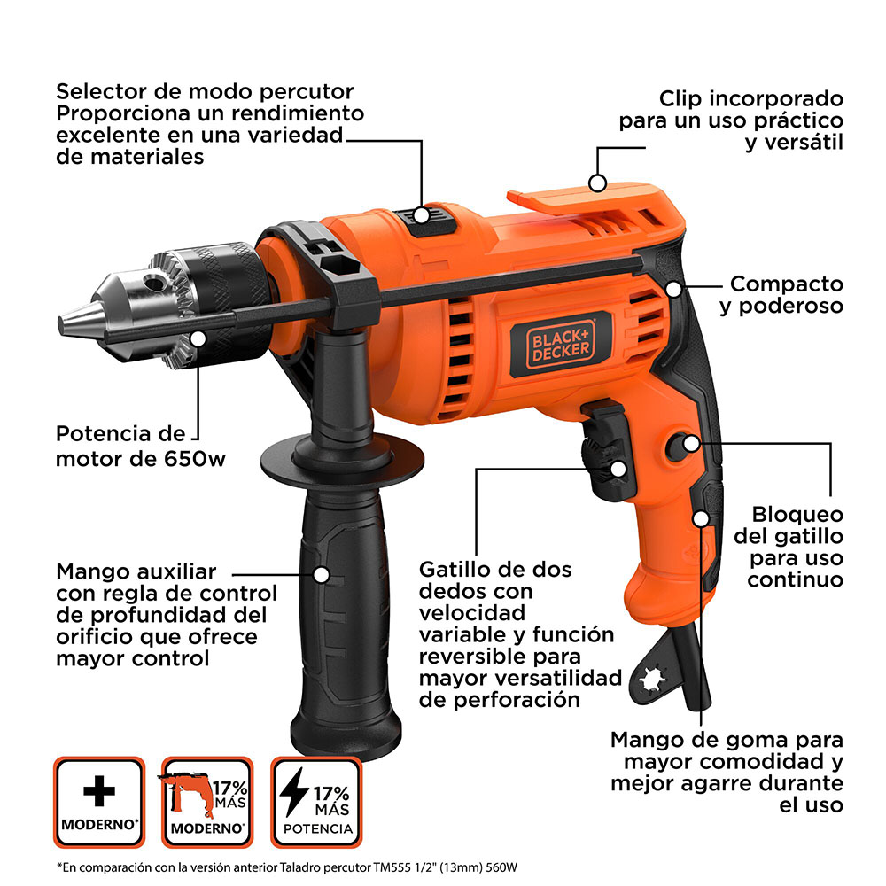 Taladro de 1/2" (13 mm) 650 W con velocidad variable reversible de 0 - 2800 RPM. Permite ajustar la velocidad según el material y la tarea. Percusión 0 a 48.000 IPM. Con un peso de solo 2.1 kg y un largo de cable de 1.8 m. Además, incluye una empuñadura lateral y una barra de profundidad para mayor control y precisión. Reemplaza a la referencia HD555-B3-Item 39198