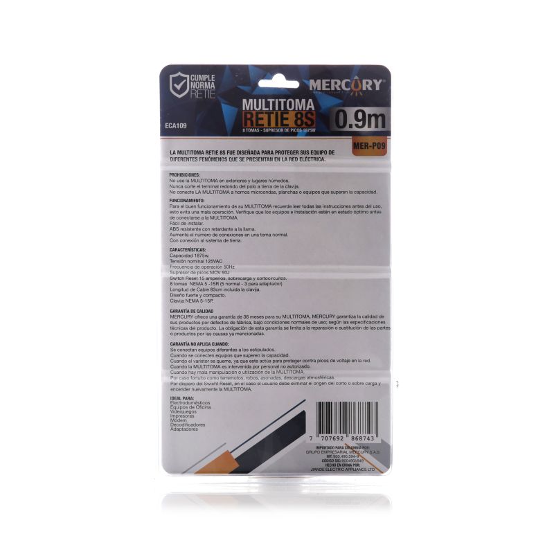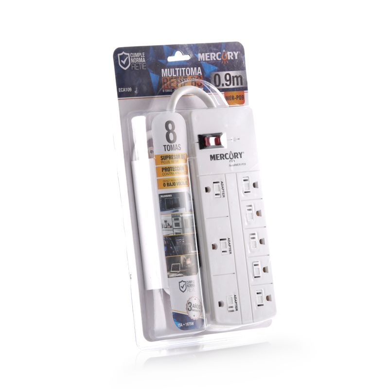 Multitoma de 8 salidas con cable de poder 0,9 metros 3X14AWG. Ideal para uso residencial. Garantia: 1 año