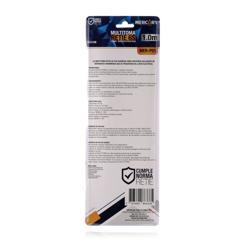 Multitoma de 6 salidas con cable de poder 0,9 metros 3X14AWG. Ideal para uso industrial y residencial. Garantia 1 año