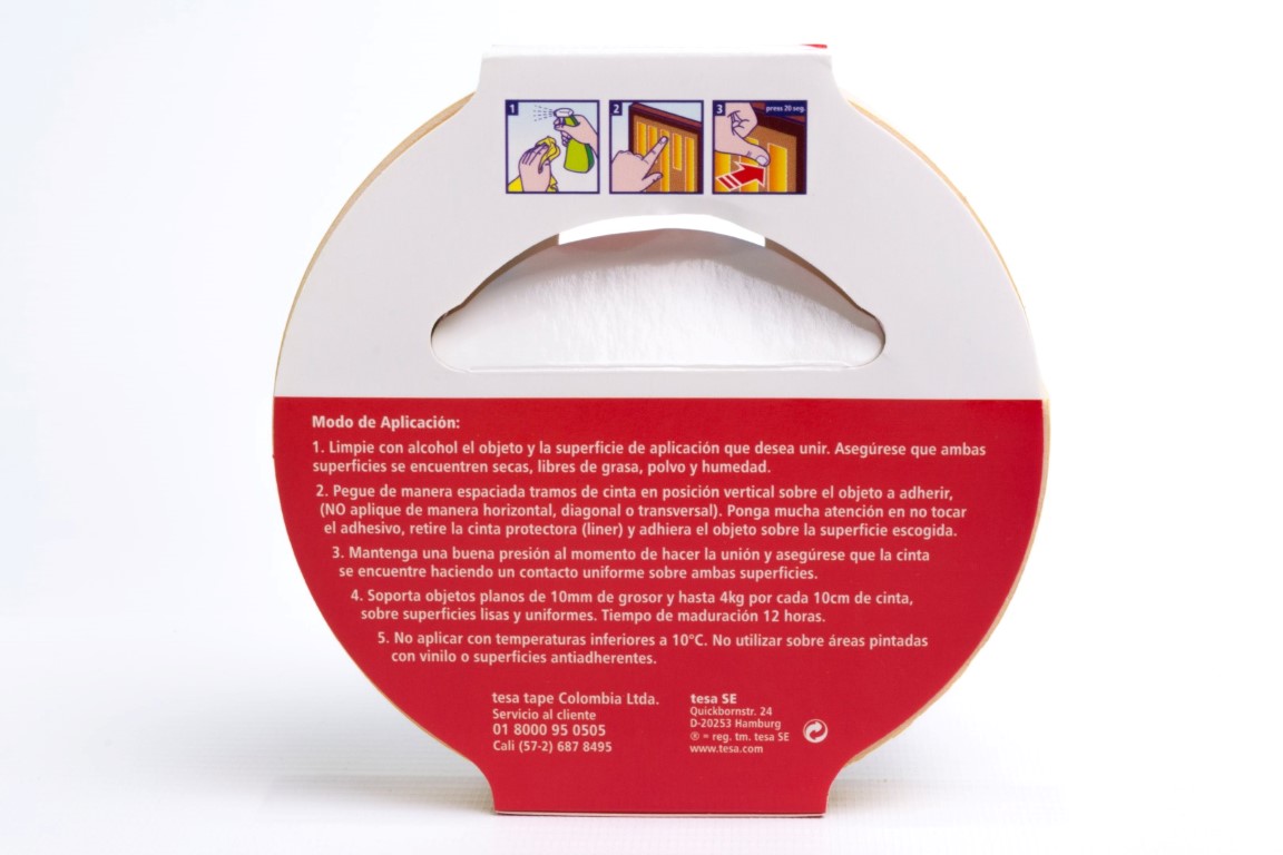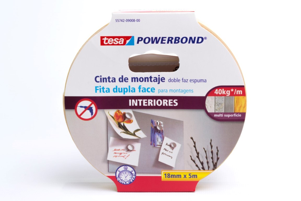 Cinta doble faz de uso interior para el montaje permanente de objetos sobre superficies lisas y rugosas. Soporte de espuma y adhesivo de caucho sintético para una fuerte adhesión de objetos planos con pesos de hasta 4 kg por cada diez centímetros de cinta. Resistente al deslizamiento. Excelente fuerza de cizallamiento y resistencia a las cargas. No se amarillea con el tiempo.