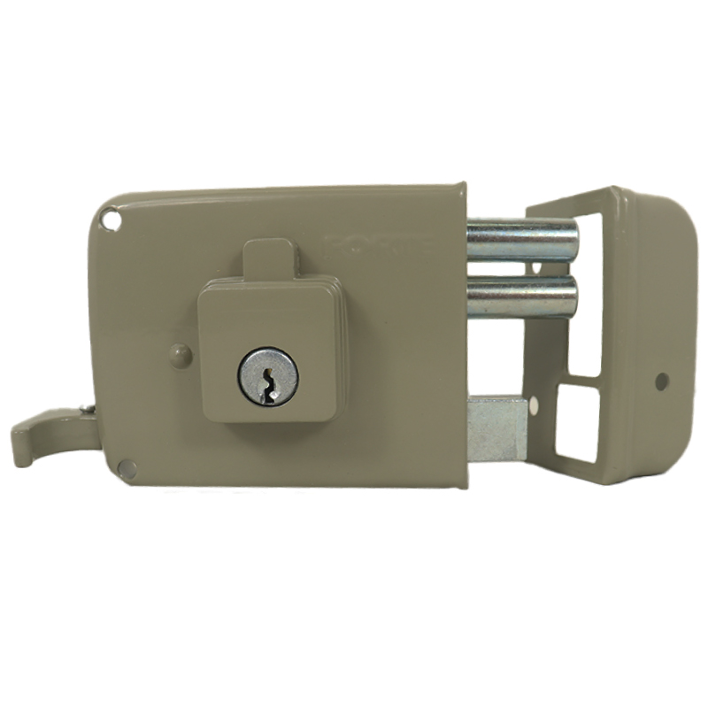 Cerradura de sobreponer con dos pasadores en acero calibrado Ø 12 mm. Caja y cantonera en acero Cold Rolled cal. 18 (1,2 mm) con mecanismo interno en calibres 14 (1,9 mm), 16 (1,5 - 1,6 mm) y 18 (1,2 mm). Cilindro exterior de 5 pines con pines codificados y porta cilindros en zamak. Acabado en pintura electrostática de alta resistencia. Para puertas metálicas y de madera de 35 mm de espesor. Cierre de seguridad con 3 vueltas de giro. Apertura exterior con llave; interior con manija para el picaporte y llave para los pasadores.