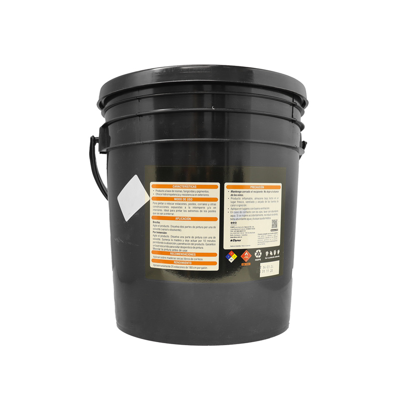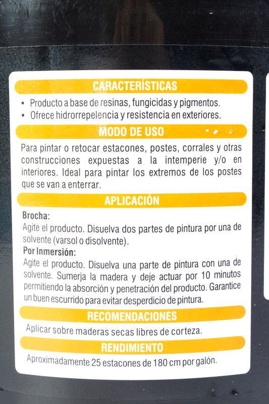 Producto impermeabilizante para retoque y pintura de estacones, postes, cercas, portones, talanqueras, corrales, entre otros. Ideal para extremos de postes que se van a enterrar. Máxima impermeabilización. Es pintura, no brea diluida. Secado rápido: Entre 15 y 20 minutos si es aplicado con brocha, 1 hora si se aplica por inmersión. Alto grado de cubrimiento. Rendimiento óptimo de 25 a 30 estacones por galón (sin diluir). Es un producto amigable con el medio ambiente. Soluble en varsol, thinner y gasolina. Preparación 1 en 1 (1 Porción de Pintura + 1 Porción de Solvente). Presentación en balde de 2.5 galones . Referencia IMPDO12 de Pinte.