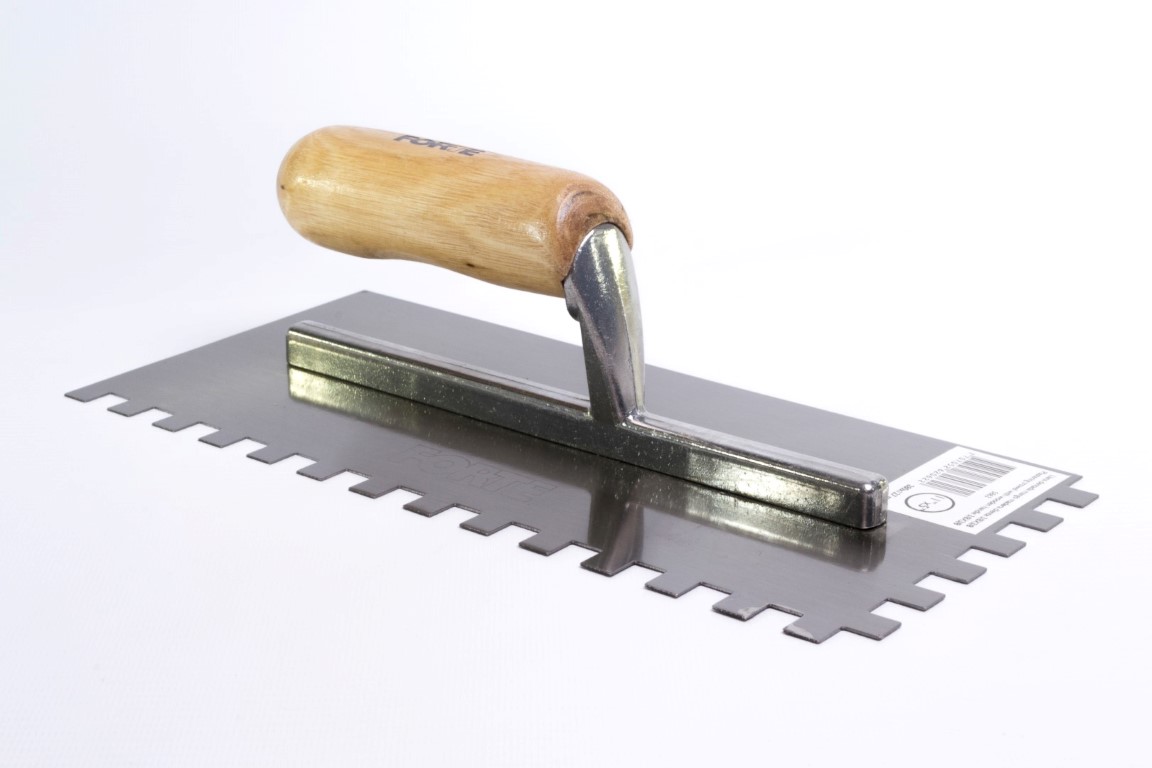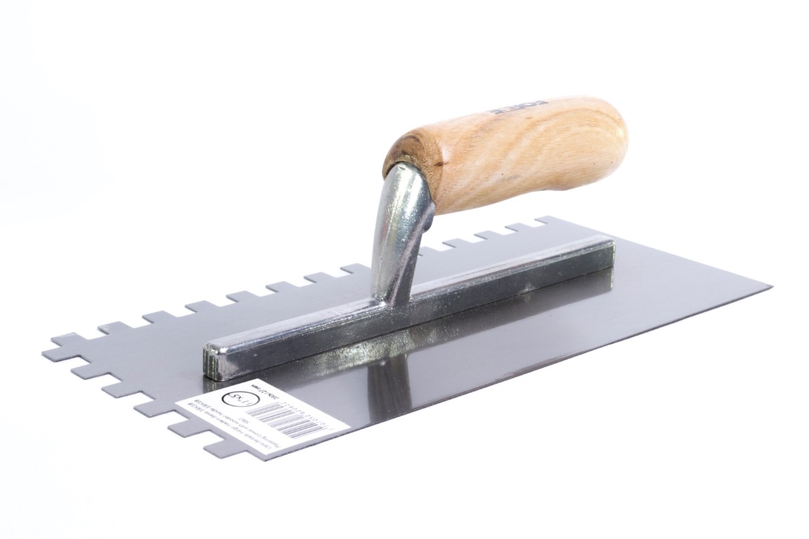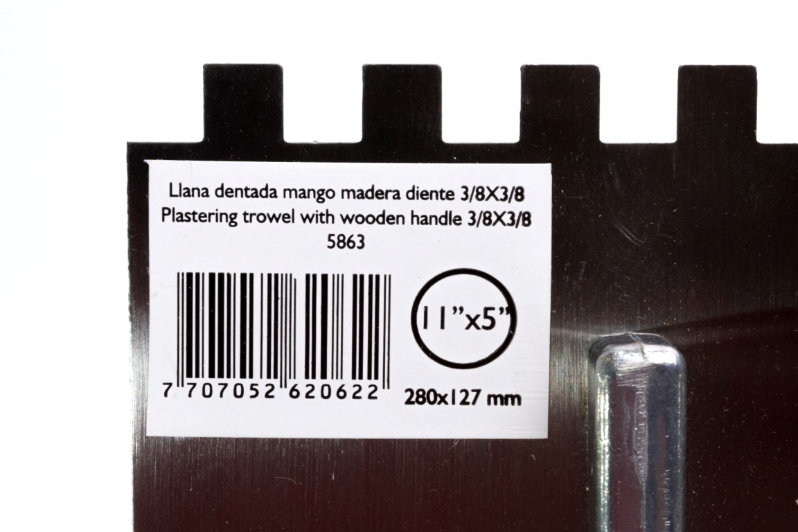 Fabricado en acero al carbono, mayor durabilidad y resistencia. Para trabajos de albañilería principalmente, para extender o aislar revoques, tanto en pisos como paredes. Dentada para pegado de pisos y enchapes, paso pequeño. Mango madera. Medida 11pg x 5pg, Diente de 3/8pg x 3/8pg.