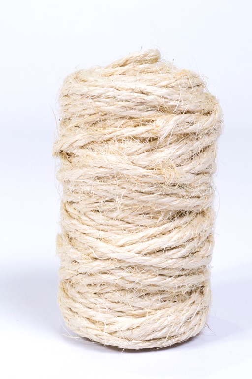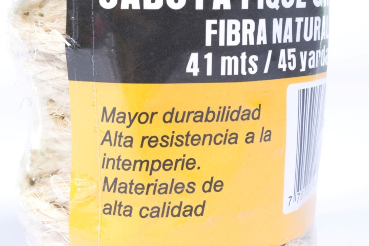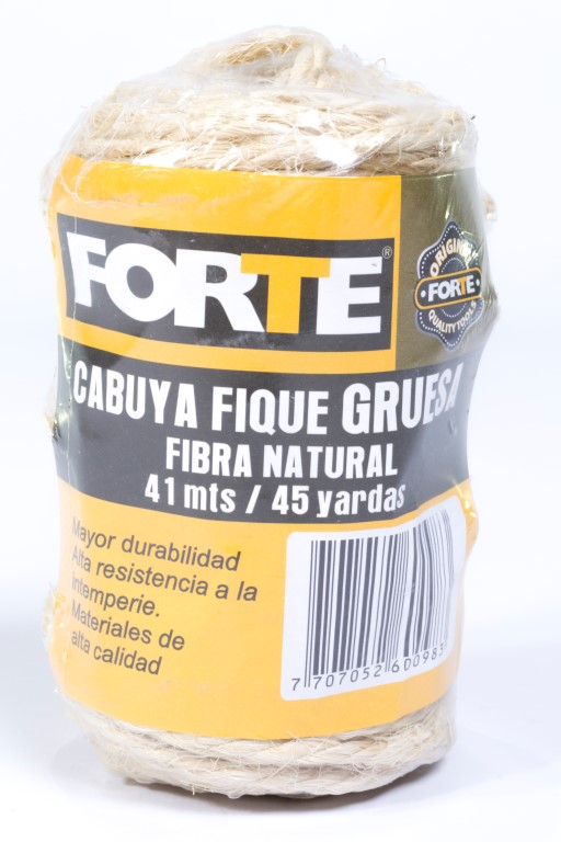 Fique (fibra vegetal) Biodegradable 100%, color natural, resistencia mínima a la tensión 59 Kgf, 31 metros, 180 gramos. Estructura 3 cabos.