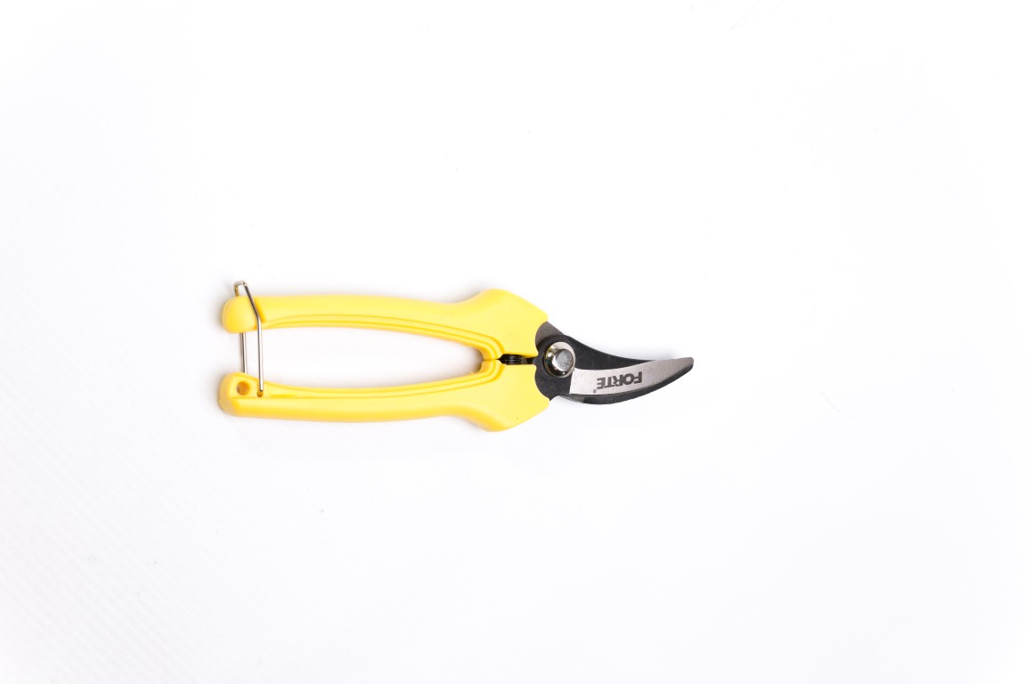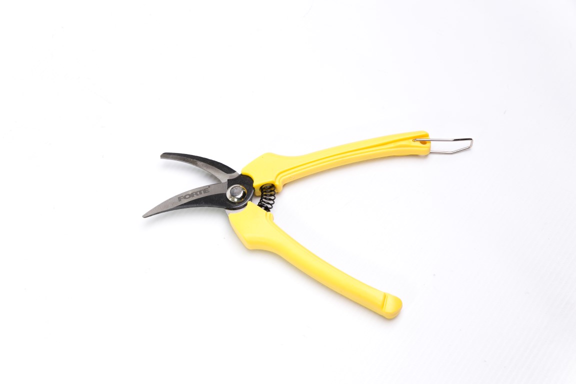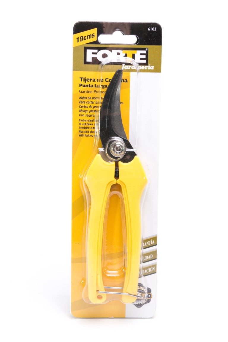 Hojas en acero al carbono. Mangos recubiertos en plástico y fibra de vidrio. Incluye seguro. Útil para cortes de hojas, tallos, frescos, húmedos y secos.Cosecha punta larga de 19 cms.