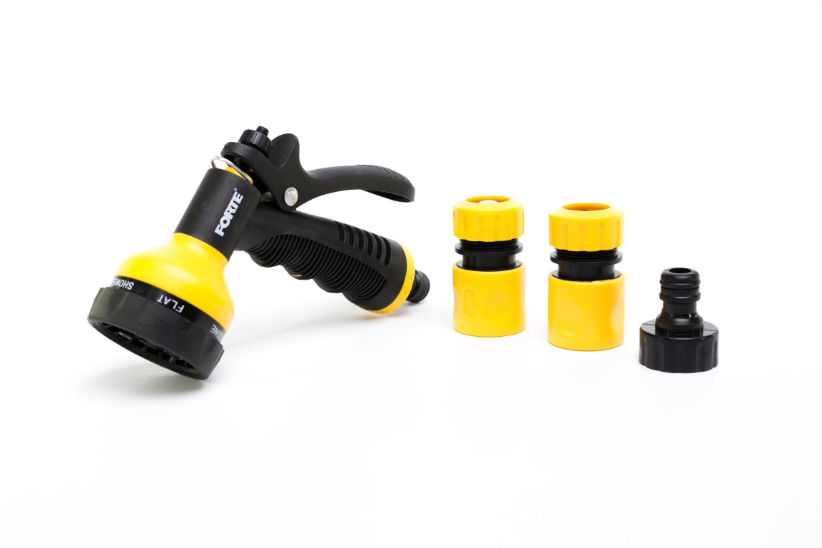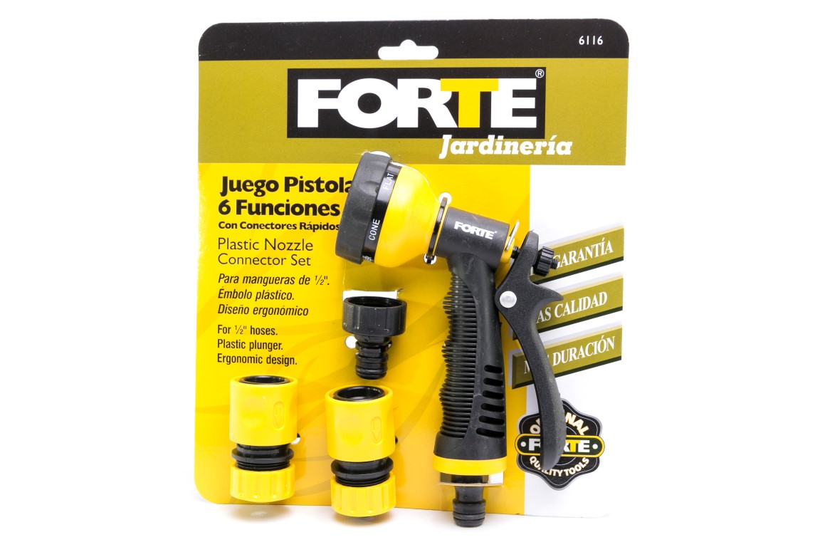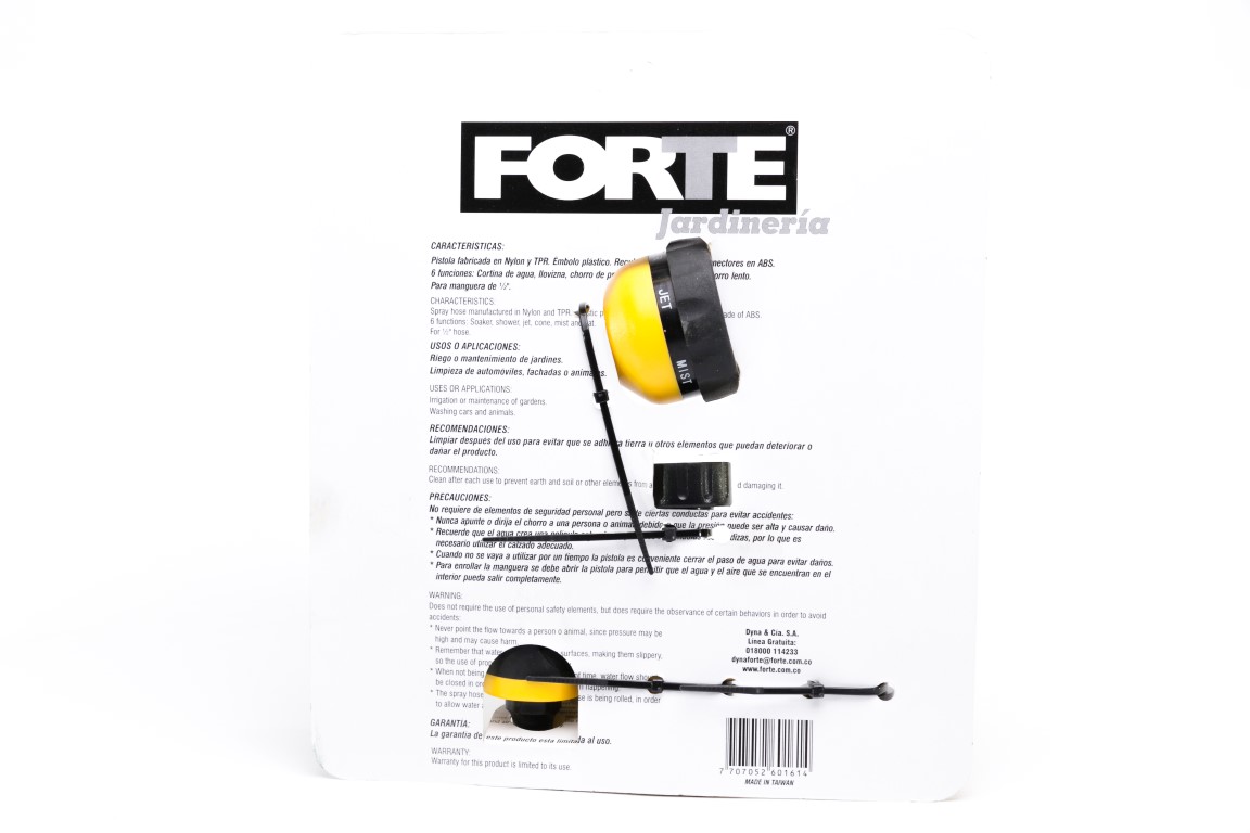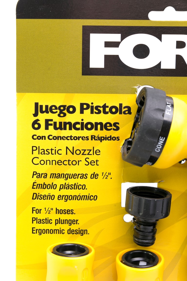 Fabricada en Nylon y TPR (caucho), recubrimiento Softrip (Agarre suave), diseño ergonómico. Incluye: conectores rápidos para mayor eficiencia. Embolo plástico. 6 funciones de aspersión: cortina de agua, llovizna, chorro precisión, abanico, roció y chorro lento.
