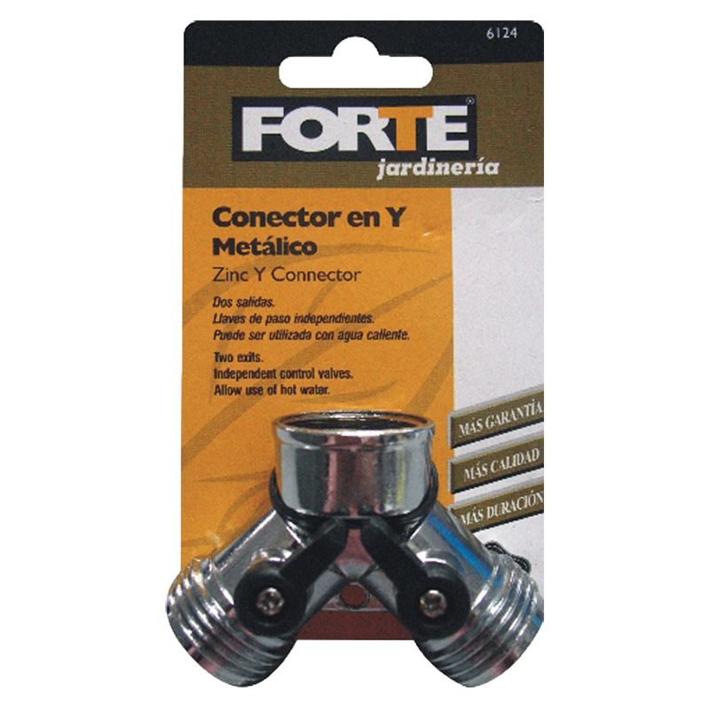 Fabricado en Zamak. Conector en Y de 2 Salidas. Alta resistencia y durabilidad, resistente a la intemperie, puede ser usado con agua caliente. Usado en mangueras de 1/2pg. Útil en el riego de jardines y limpieza de automóviles o animales. Empaque tarjeta y blíster.