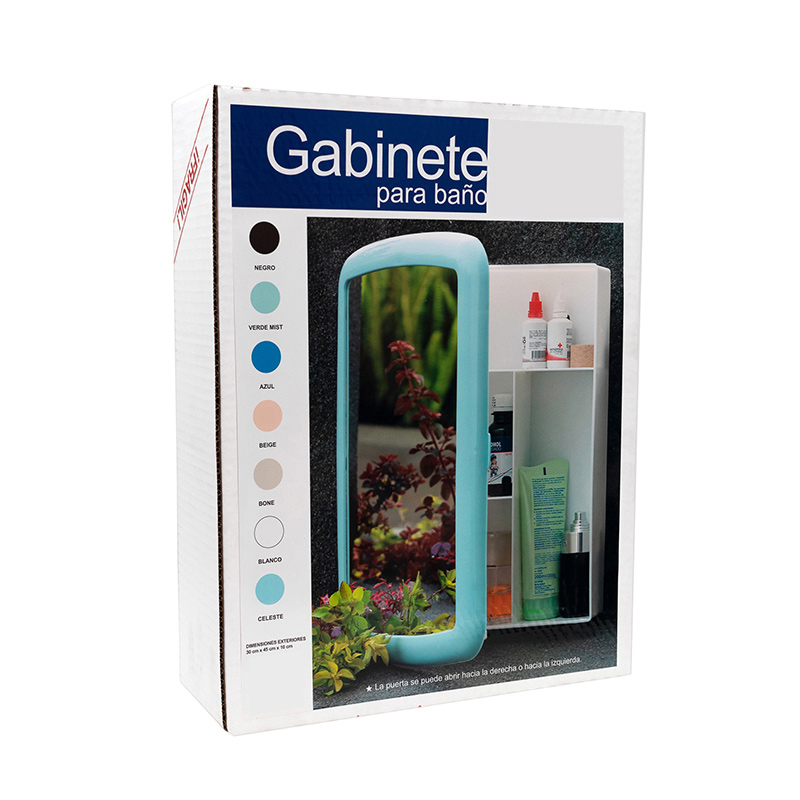 Gabinete con práctico diseño con divisiones interiores y espejo rectangular. Diseño de apertura hacia la izquierda o derecha según su instalación. Medidas: Gabinete: 30 cm x 40.5 cm x 10 cm. Marco : 34 cm x 45 cm. Peso: 1275 gr. Fabricado con polímeros de alta resistencia y durabilidad.Apariencia moderna y elegante. Apariencia moderna y elegante.