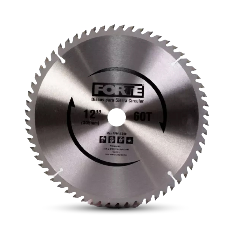 Cuerpo fabricado en acero al carbono para mayor resistencia. Diente con pastilla de tungsteno para mayor dureza y rendimiento en el corte. Pastilla de tungsteno soldada por láser que evita el desprendimiento en el momento de operación. Se utiliza para corte de madera. Diámetro 12pg, # de dientes 60, Eje 30 mm * con bujes 1pg (25 mm) y 5/8pg (16 mm). Empaque blíster individual con bujes incluidos.