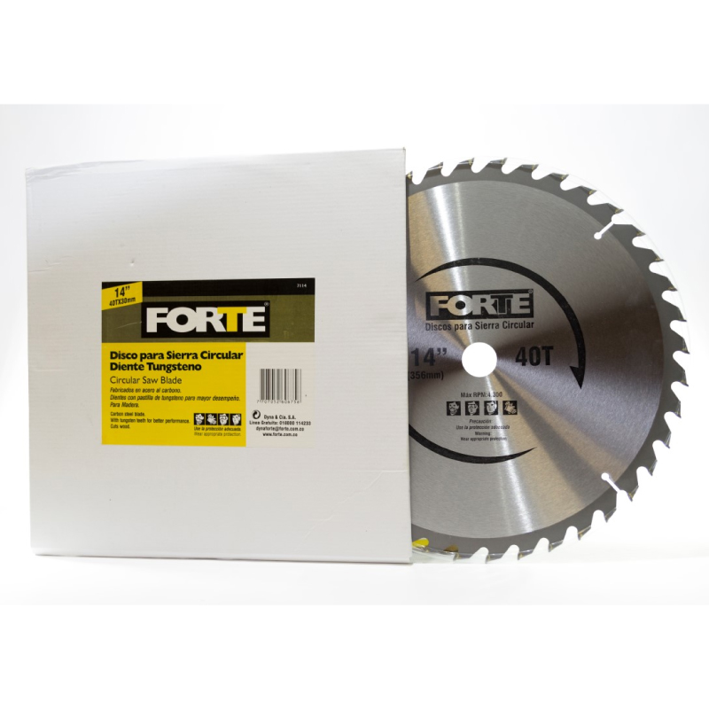 Cuerpo fabricado en acero al carbono para mayor resistencia. Diente con pastilla de tungsteno para mayor dureza y rendimiento en el corte. Pastilla de tungsteno soldada por láser que evita el desprendimiento en el momento de operación. Se utiliza para corte de madera. Diámetro 14pg, # de dientes 40, Eje 30 mm * con bujes 1pg (25 mm) y 5/8pg (16 mm). Empaque blíster individual con bujes incluidos.