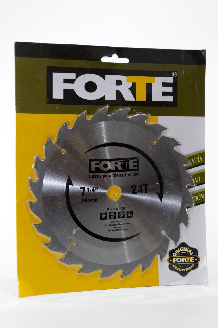 Cuerpo fabricado en acero al carbono para mayor resistencia. Diente con pastilla de tungsteno para mayor dureza y rendimiento en el corte. Pastilla de tungsteno soldada por láser que evita el desprendimiento en el momento de operación. Se utiliza para corte de madera. Diámetro 7.1/4pg, # de dientes 24, Eje 5/8pg. Empaque blíster individual con bujes incluidos.