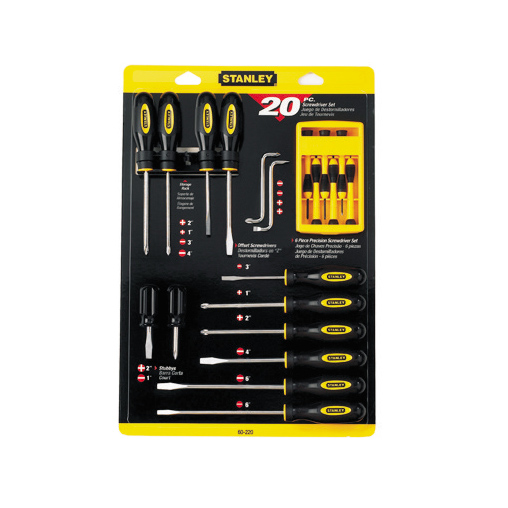 STMT60220-LA. 20 Piezas · Contenido:Destornilladores basic (1) 1/4 x 2 pul · (1) #2 x 2 pul · (2) #2 x 4 pul · (2) #1 x 4 pul · (1) 3/16 x 6 pul · (1) 1/4 x 6 pul · (2) 1/4 x 4 pul · (2) 3/16 x 3 pul + Juego de Destornilladores de Precisión + Destornilladores Acodados