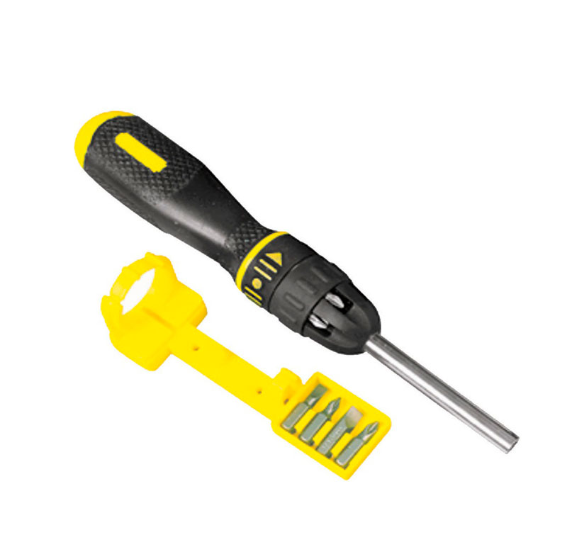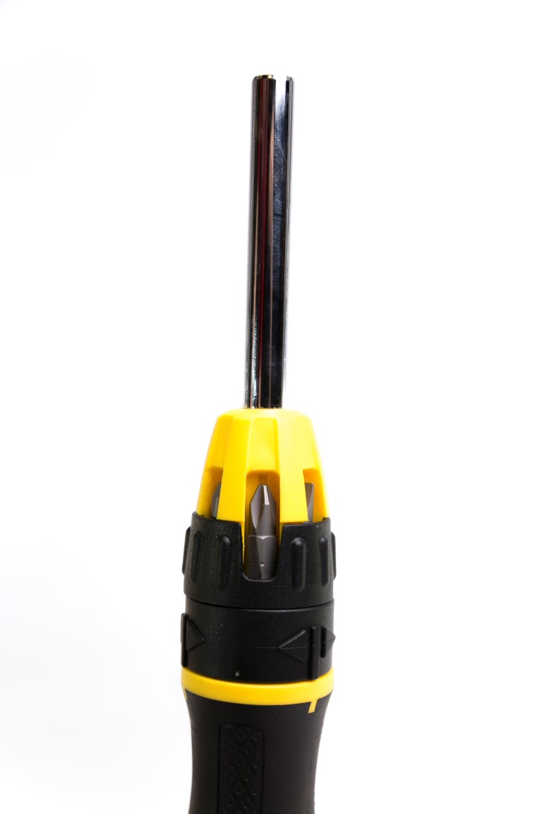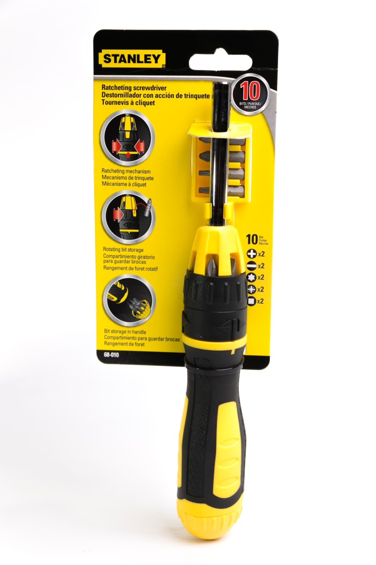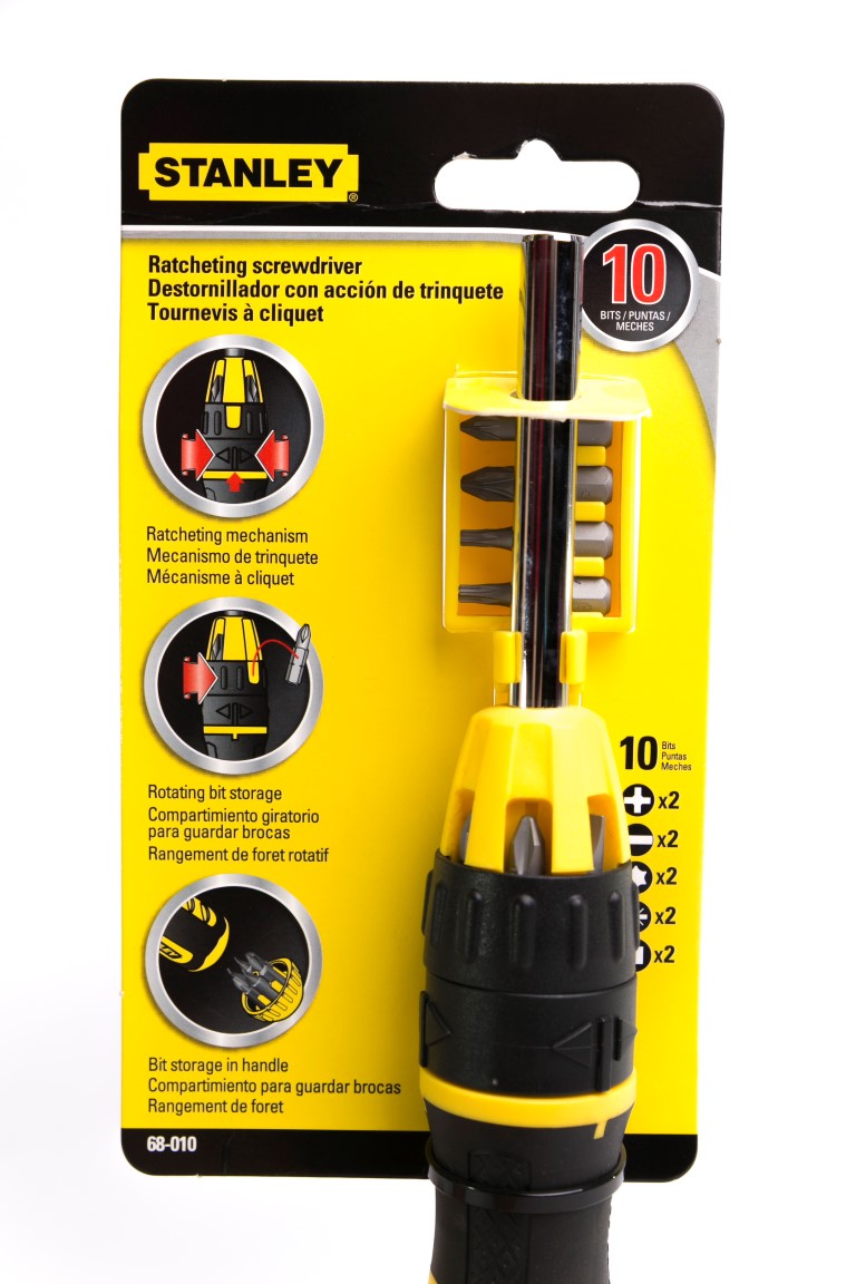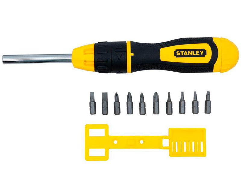 [04] 68-010. El seguro de tres posiciones, permite el ajuste de las posiciones del ratchet a la derecha, izquierda y bloqueado. Almacenamiento en el Mango, para un fácil y rápido acceso a las puntas. Sujetador magnético de puntas, para un cambio rápido y seguro de las puntas. Su mango ergonómico texturizado, alcanza el máximo torque con el mínimo esfuerzo. Recubierto para brindar resistencia a la corrosión. Contenido: 10 piezas planas (2) 1/4" y 3/16" + Phillips (2) #1, #2 Torx (2) T10, T15, pozidriv (2) PZ1, PZ2 + cuadrada (2) S1, S2.