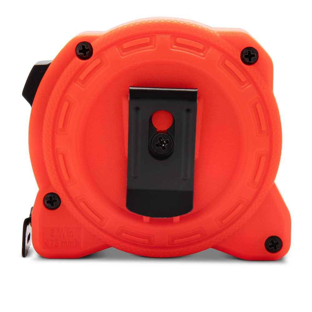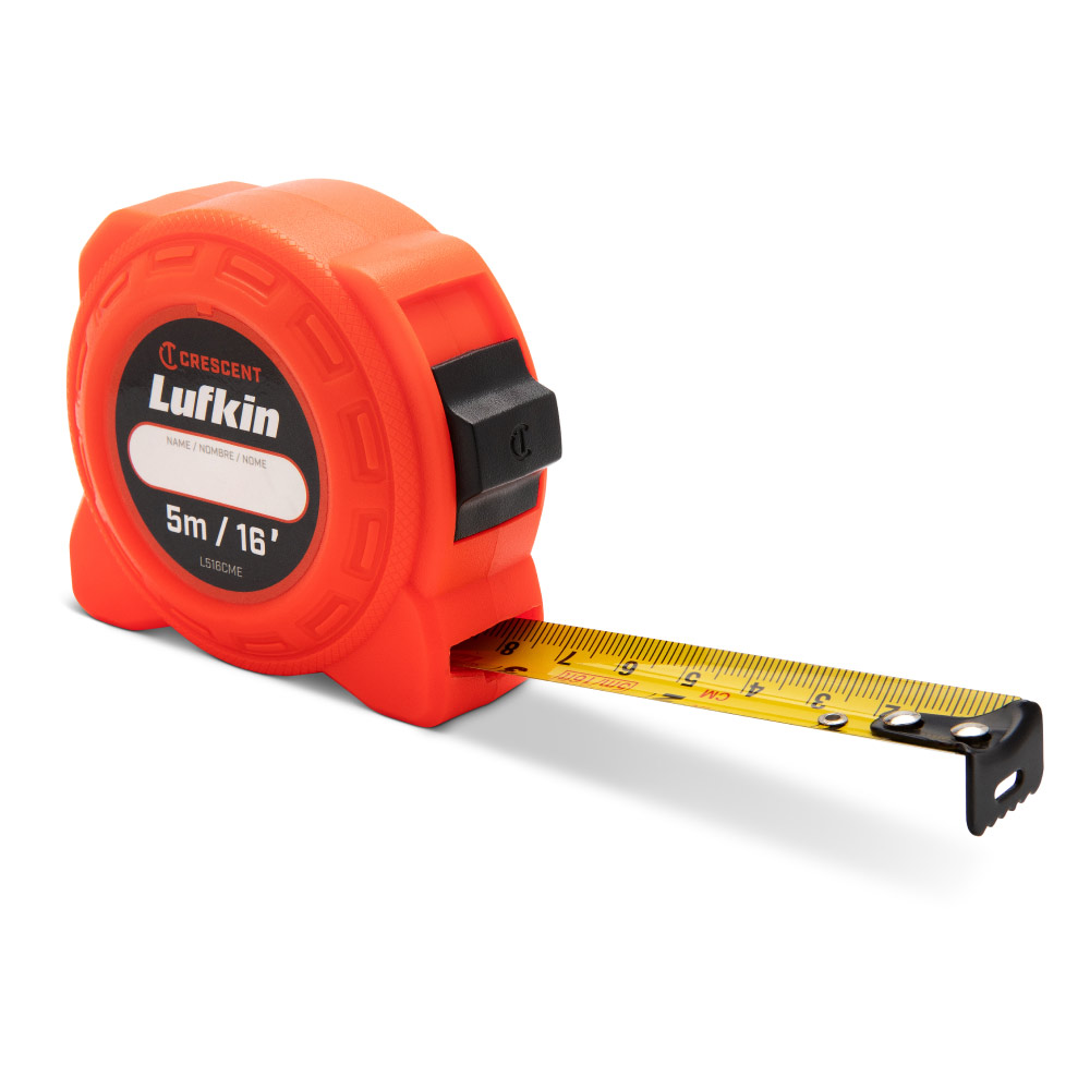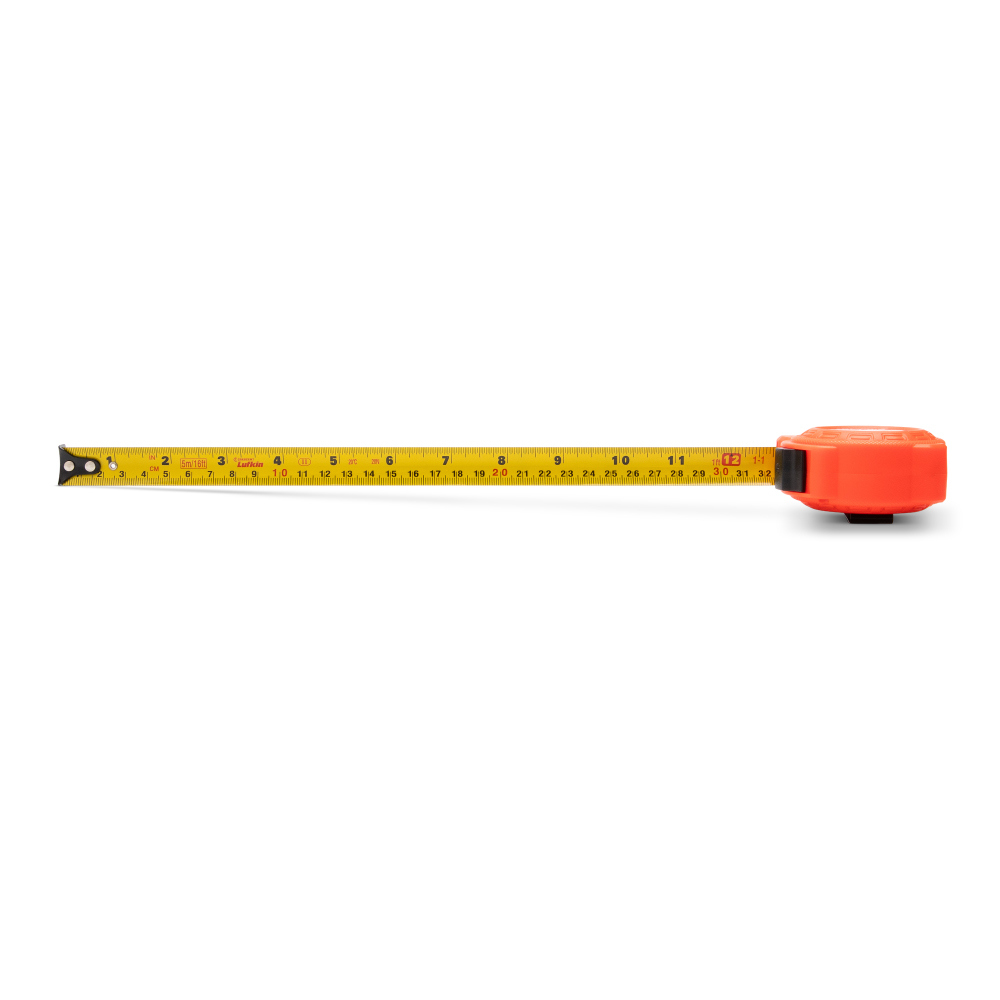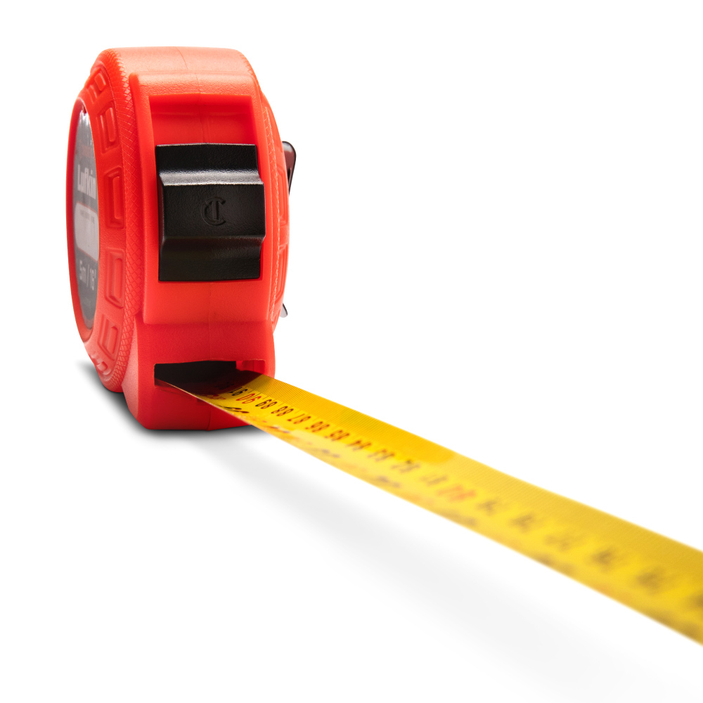 Nueva cinta NYLON FILMED con acabado Mate. Evita el reflejo de la luz, facilita la lectura de la graduación y garantiza más seguridad en el recogimiento. La cinta es elaborada en acero templado de alta calidad con recubrimiento nylon anti reflejo. La carcasa es fabricada en plástico ABS altamente resistente al impacto. El freno está formado por un botón bloqueador y un botón pisador elaborados en Nylon Ultramatic. Tiene un gancho extra largo de mayor agarre y de acero de alta calidad. El nuevo gancho tiene mayor área de contacto, con tres remaches que permite lectura lateral sin perder precisión. La Impresión es consecutiva en la escala dual, mm y pulgadas
