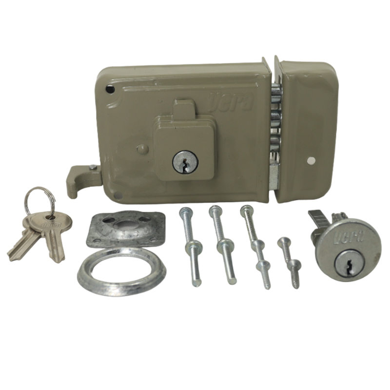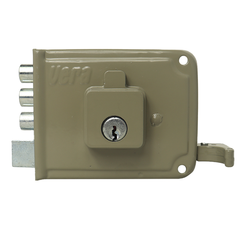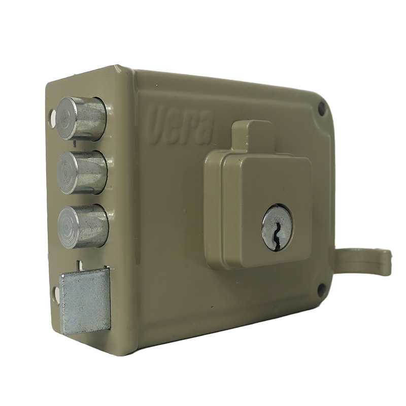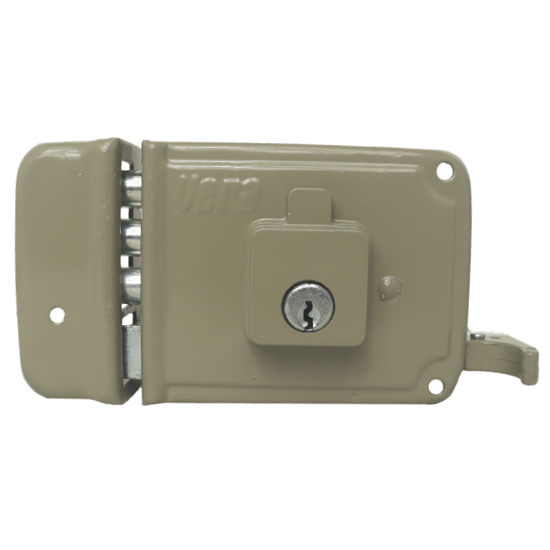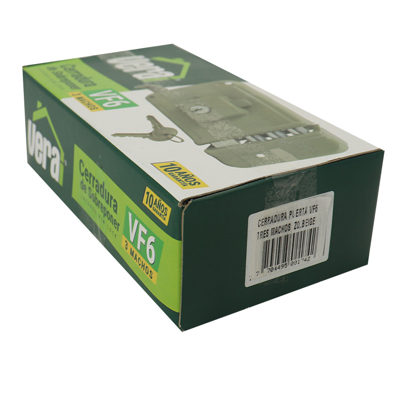 Cerradura de sobreponer de la serie VF6 con tres machos tipo bulón cilíndrico. Ideal para uso en puertas de entrada principal. Disponible para modo de apertura izquierdo. Bulones construidos en acero reforzado. Los machos se accionan totalmente con tres giros de la llave y en esta posición el picaporte queda en modo de bloqueo. Permite ser instalada con soldadura sobre cuerpos de lámina metálica. Acabado de color beige, centro de instalación de 50 mm. Cilindro de 5 pines. Para Determinar el Lado de la Puerta, Deberás Pararte Frente al Exterior. Si las Bisagras Están en el Lado Derecho, La Puerta es Derecha y si las Bisagras Están Instaladas del Lado izquierdo, La Puerta es Izquierda.