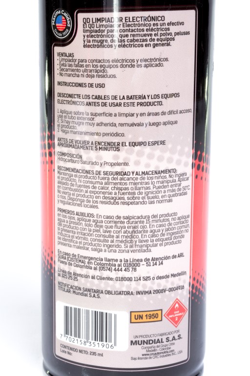 Limpia y remueve polvo y grasas livianas en equipos electronicos como tarjetas electronicas, dvds , televisores, gravadoras, equpos de sonido y telefonos.se evapora rapidamente sin dejar sin dejar residuos.no ataca el plastico importante: se deben desconectar los equipos antes de aplicar el producto