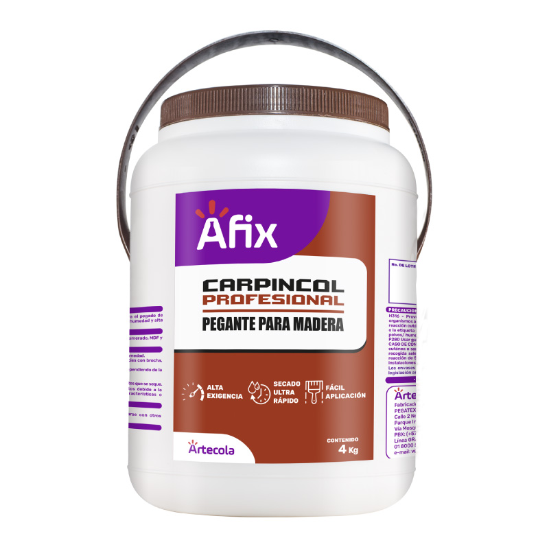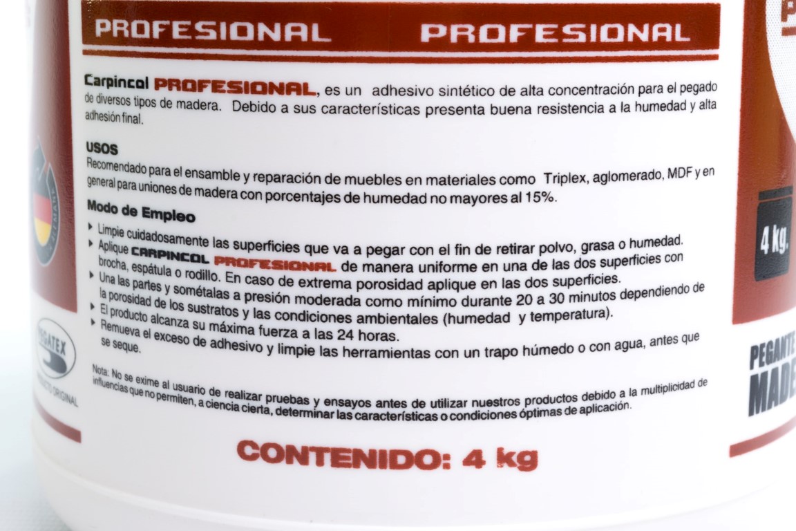 Adhesivo de envase plástico con dosificador elaborado a base de PVA (acetato de poli vinílico), para la industria de la carpintería y madera. Utilizado en maderas con un porcentaje de humedad y es de secado rápido.