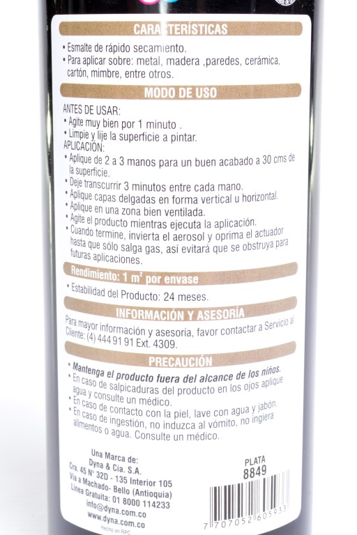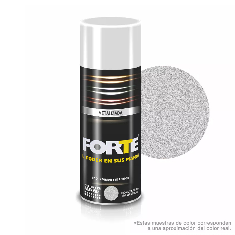 Pintura en aerosol multipropósito de acabado metalizado, especial para restauración y decoración de piezas u objetos. Ideal para aplicar en diferentes superficies como madera, metal, cerámica o concreto. Fácil aplicación y rápido secado. Rendimiento aproximado de 1m2 por envase. Alta adherencia y cubrimiento. Presentación de 400 ML. Referencia 8849 Pinte.