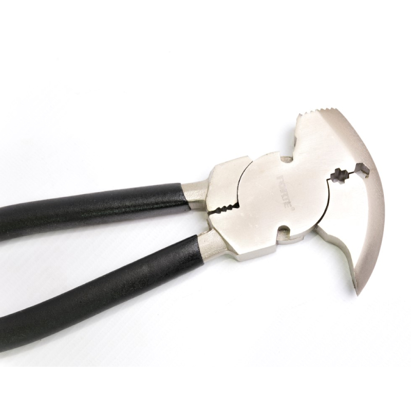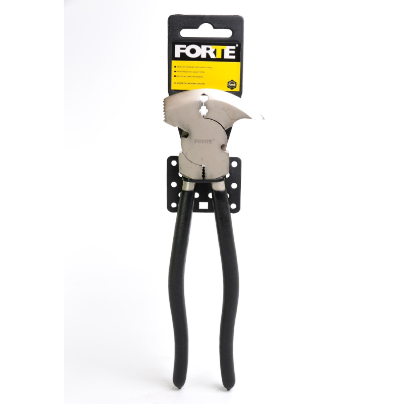 Alicate hacendado. Fabricado en acero de herramientas. Mango negro rugoso para operación segura. Útil para corte de alambre y grapas, ideal para instalación de alambre de púas.