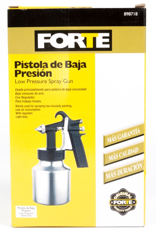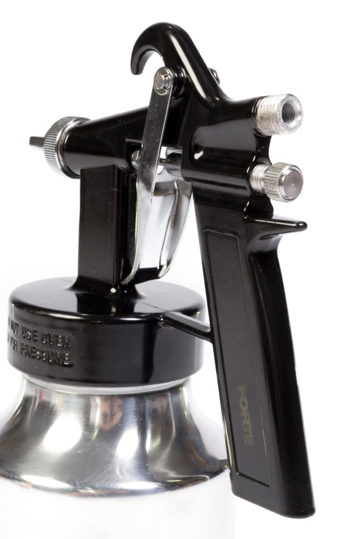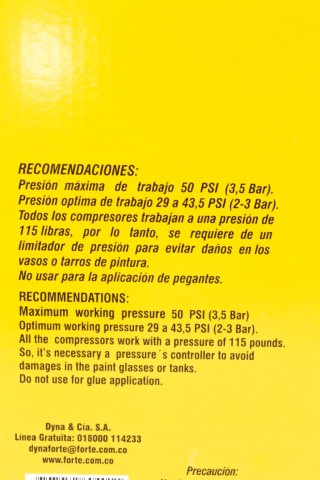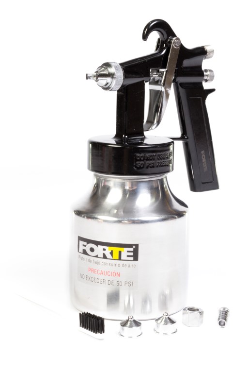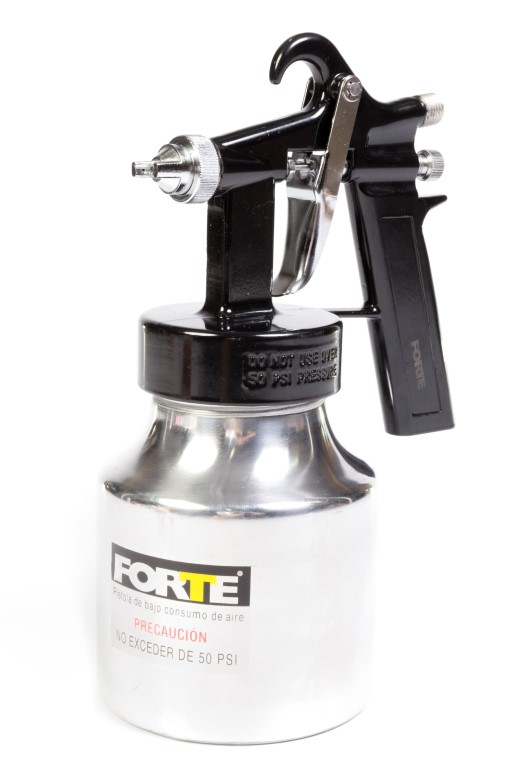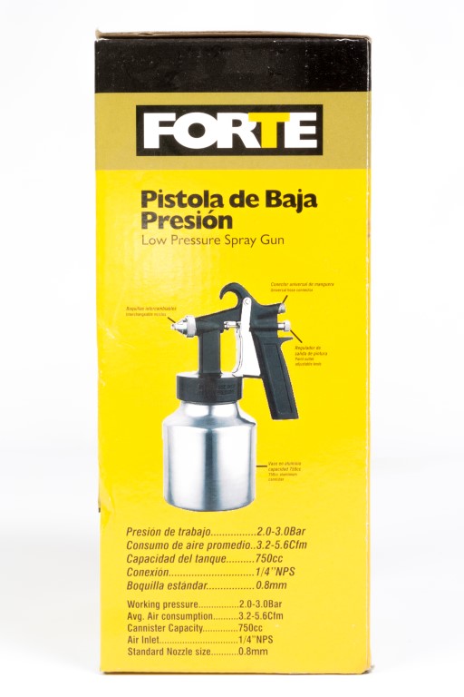Alto consumo de aire, desperdicio de pintura (35% aprox) baja presión de trabajo, Presion maxima 45 PSI, presion optima 35 a 45 PSI, diametro de boquilla 0,8 mm. Vaso de 750 c.c. No apto para químicos altamente corrosivos.