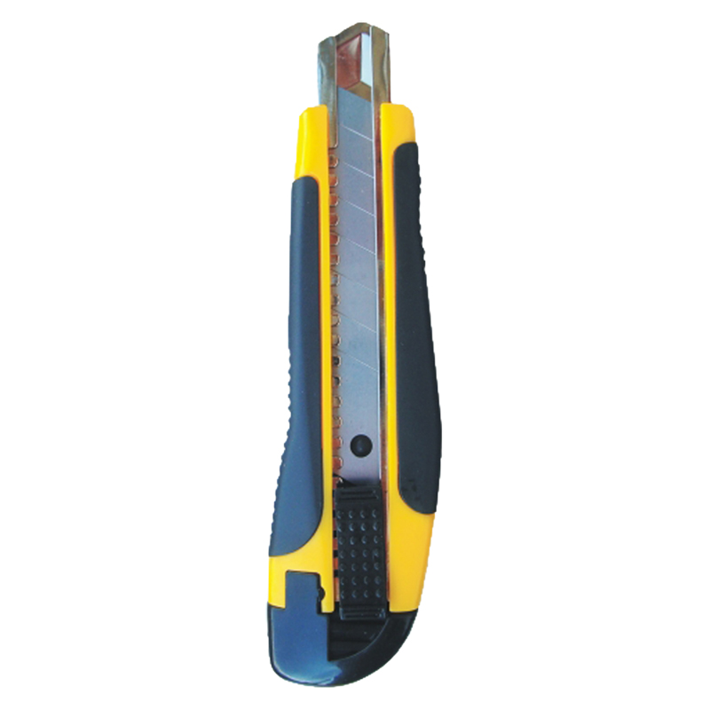 Cuerpo plástico con guía metálica y auto bloqueo. Hoja 18 mm acero alto carbono templado y revenido.
