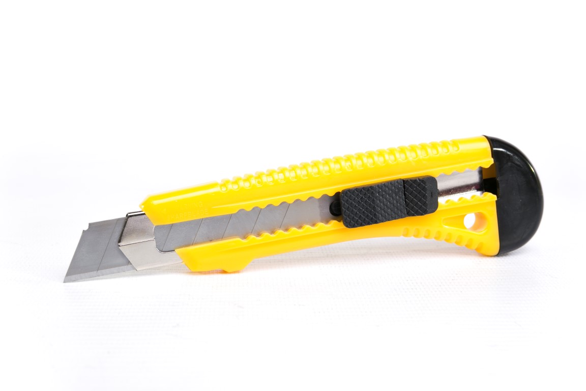 Cuerpo plástico con guía metálica. Hoja 18 mm acero alto carbono templado y revenido.
