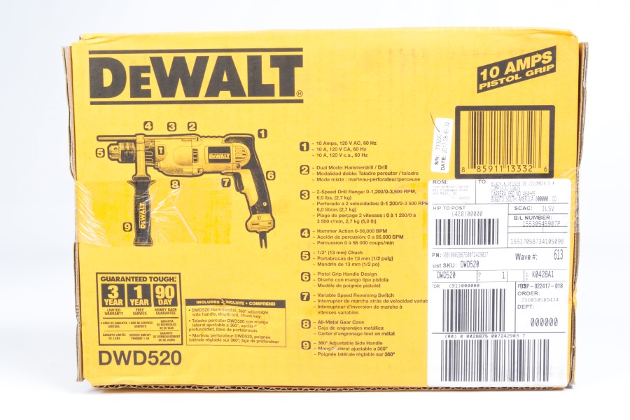Taladro Percutor 1/2 pulgada Velocidad Variable Reversible DWD520 10 Amperios ; Potencia 1.100 W ; Tamaño del Mandril 1/2 (13mm) ; RPM 0-1,200 / 0-3,500 rpm; GPM 0-56.000 gpm; Incluye Mango ajustable de 360º, llave de mandril Motor de 10 amperios incrementa la capacidad de perforar; Construcción patentada del motor DEWALT que incrementa hasta en 50% el poder; 2 modos – Taladrado y percusión para mejor desempeño en mampostería, madera y acero; 2 velocidades para taladrado rápido o mayor torque al taladrar