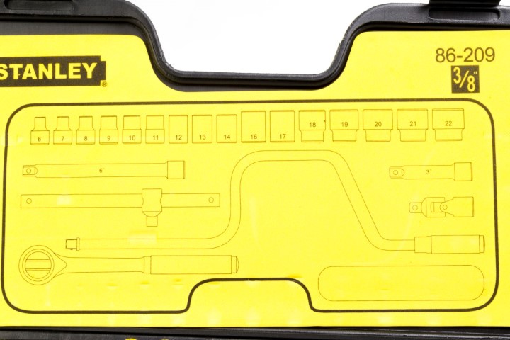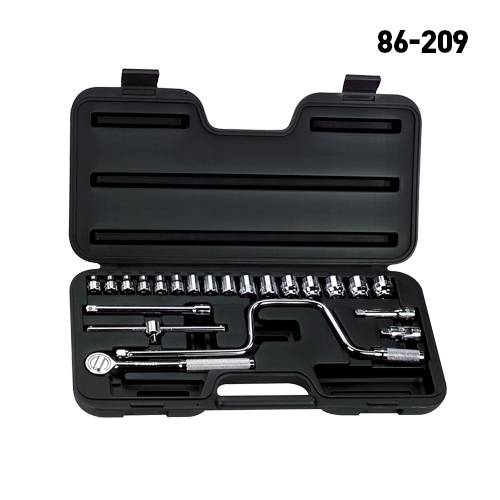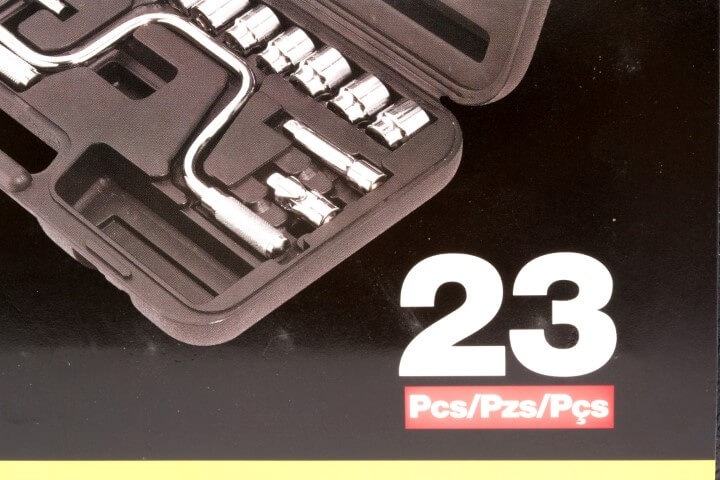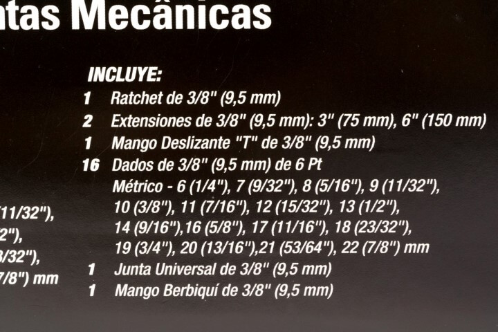 23 Piezas · Contenido · (1) 3/8 pul Ratchet · (2) 3 & 6 pul Extensión · (16) 6, 7, 8, 9, 10, 11, 12, 13, 14, 16, 17, 18, 19, 20, 21 & 22 mm Dados · (1) Barra Deslizante “T” · (1) Junta Universal · (1) Mango Berbiqui · (1) Caja Almacenaje
