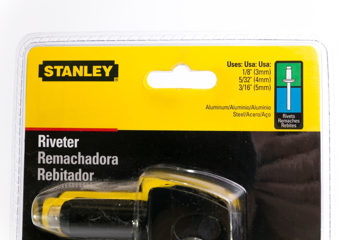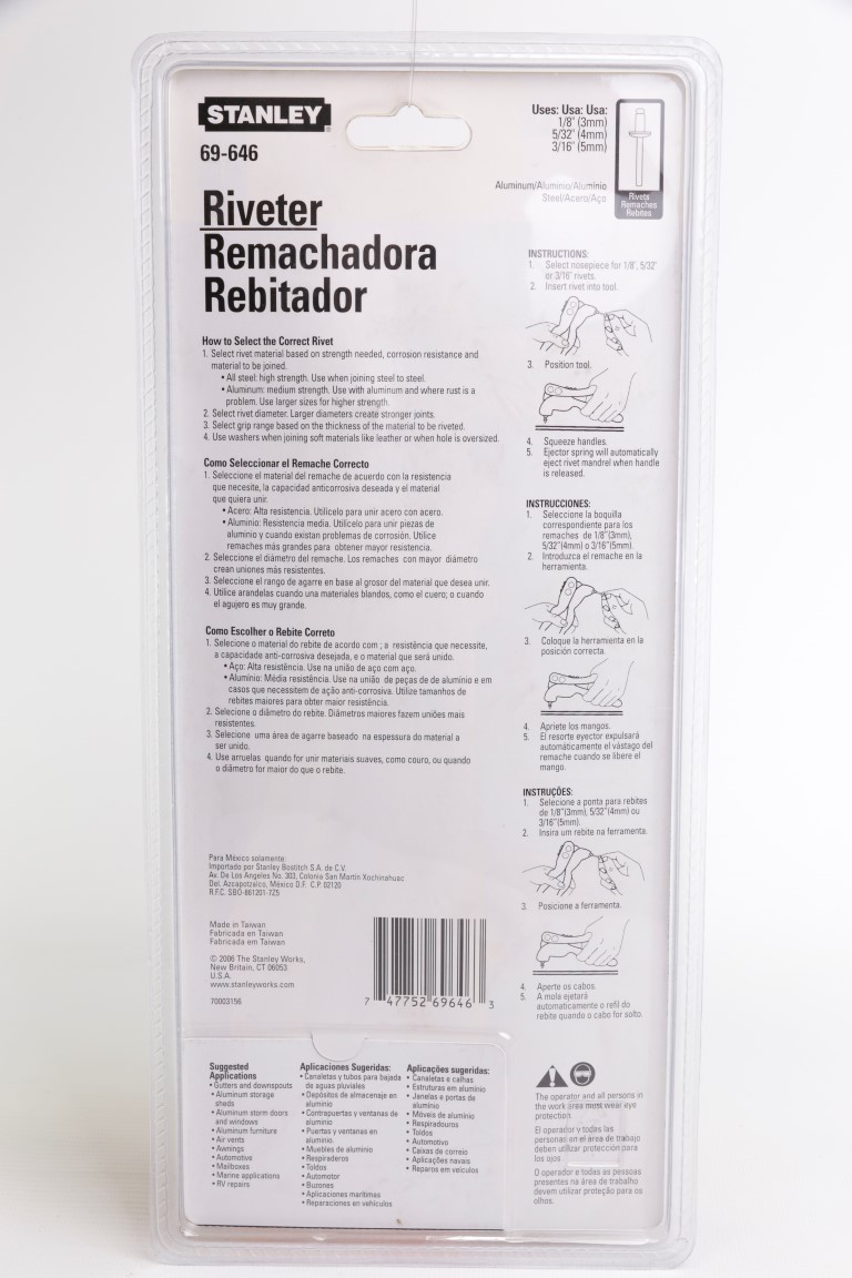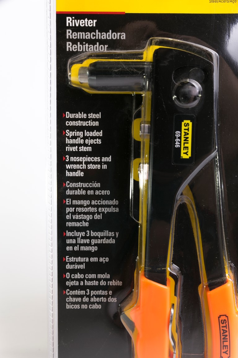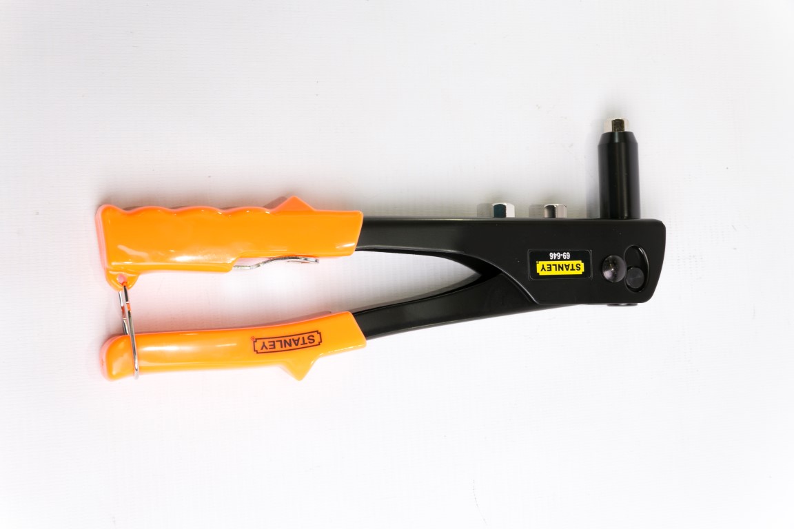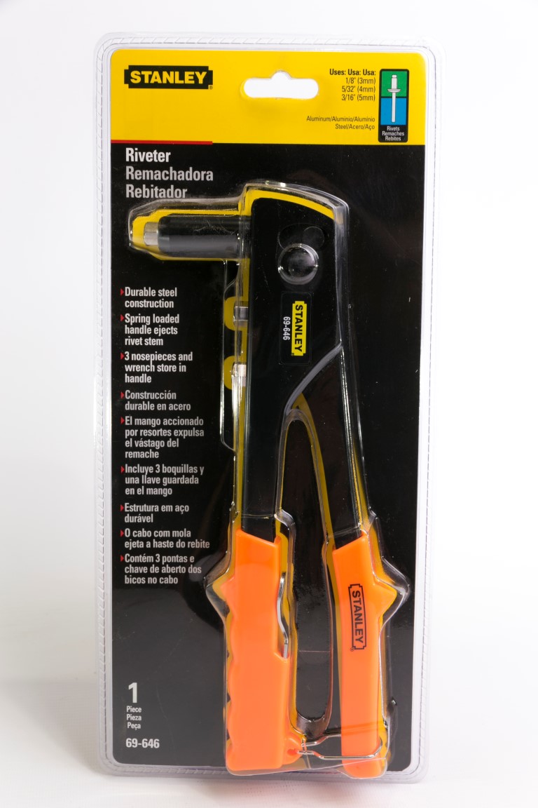 Remachadora de construcción durable en Acero. El mango es accionado por resortes que expulsa el vástago del remache. Incluye 3 boquillas y una llave guardada en el mango. Remaches: 1/8, 5/32, y 3/16