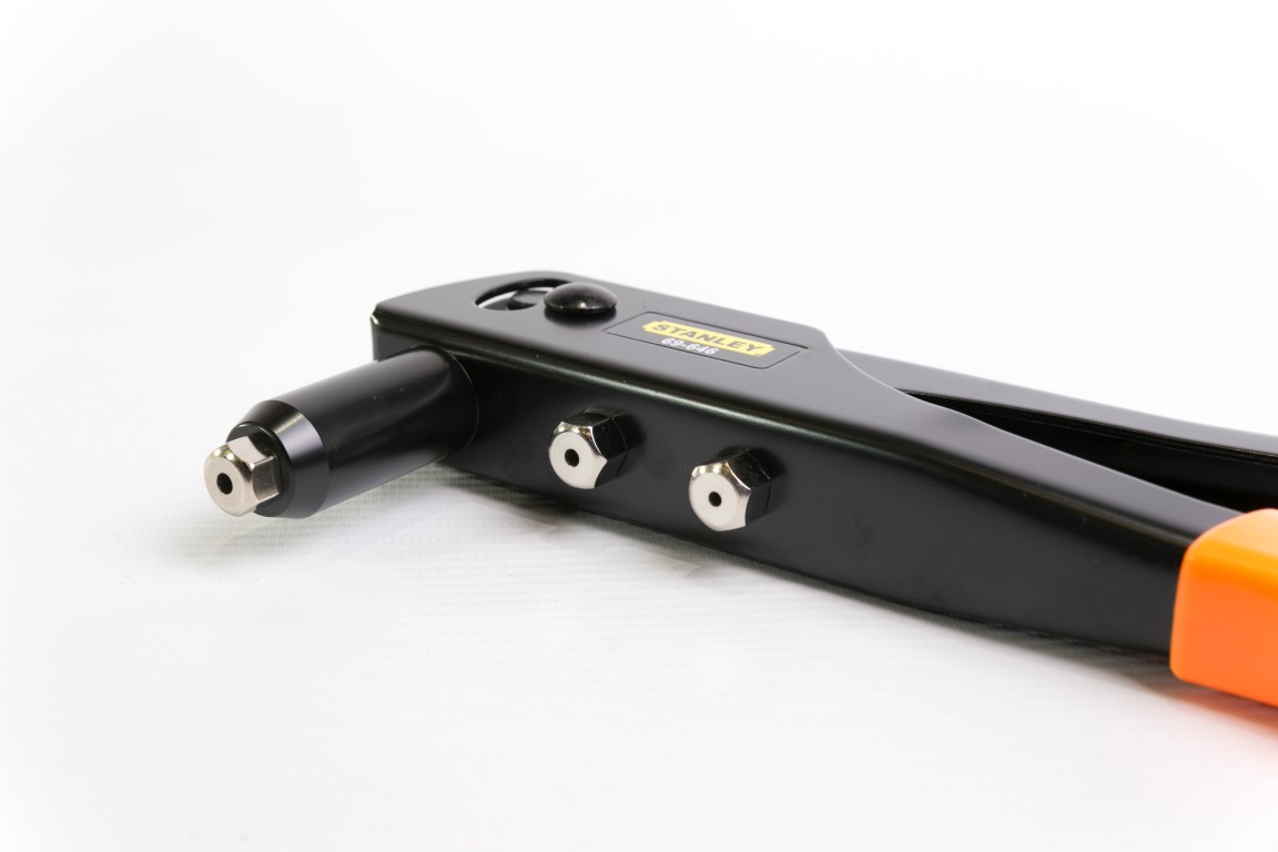 Remachadora de construcción durable en Acero. El mango es accionado por resortes que expulsa el vástago del remache. Incluye 3 boquillas y una llave guardada en el mango. Remaches: 1/8, 5/32, y 3/16