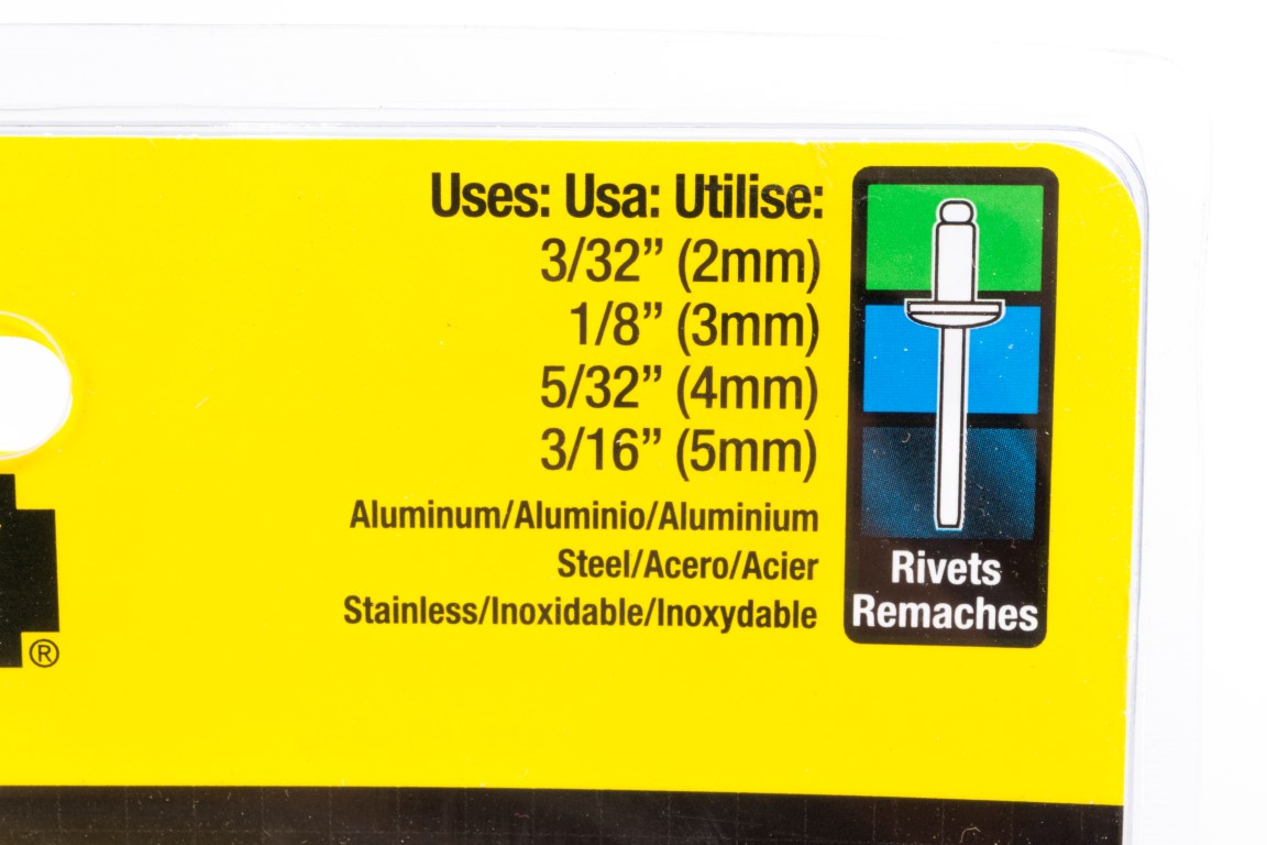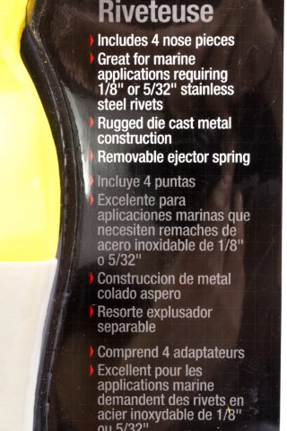 El mango largo hace remachadora fácil de apretar. Construcción robusta, contratista de grado de fundición a presión de metal para una larga vida. Diseñado para remaches de acero inoxidable en aplicaciones marinas. Equipado con muelle expulsor extraíble4 Bocas: 1/8 pg, 3/32pg, 5/32 pgy 3/16pg de diámetro y remaches de acero de aluminio. Usa 1/8 pgy 5/32pg remaches de acero inoxidable de diámetro