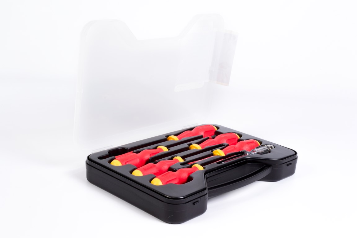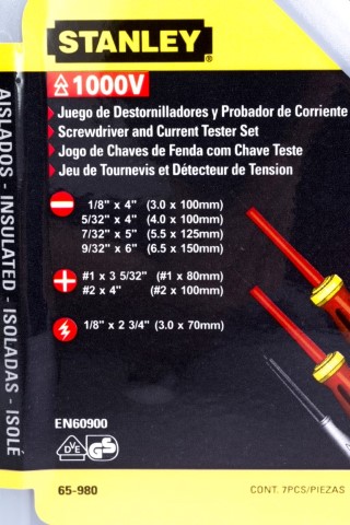 7 Piezas · Contenido · (5) 2.5, 3, 4, 5.5, 6.5 mm Punta Estandar · (2) #1, #2 Punta Phillips. "Cumple con la norma EN60900.Probados individualmente a 10,000V y certificados a 1,000V.Mango ergonómico, no resbala y resiste a los impactos.Insulado en molde inyectado directamente a la barra."