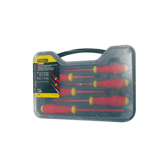 7 Piezas · Contenido · (5) 2.5, 3, 4, 5.5, 6.5 mm Punta Estandar · (2) #1, #2 Punta Phillips. "Cumple con la norma EN60900.Probados individualmente a 10,000V y certificados a 1,000V.Mango ergonómico, no resbala y resiste a los impactos.Insulado en molde inyectado directamente a la barra."